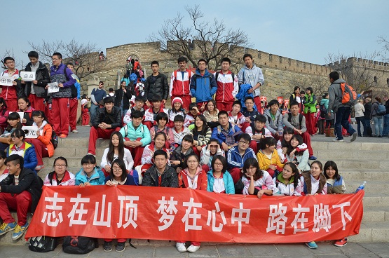出发前,高三年级组做了充分的动员工作,要求各班充分发挥创造力,在长城上进行主题教育活动。在长城之巅,全年级的师生同在“十年磨一剑,六月显锋芒,长城今好汉,明日缚苍龙”的横幅前合影理念。各班也做了精心的准备,组织了丰富多彩的励志活动,同学们纷纷打出、喊出“拼搏无悔,追求最美”、“倾你我之力,创一生无悔”、“奋斗,长城为我见证”等一系列的口号,有的班级还围坐一团合唱励志歌曲。