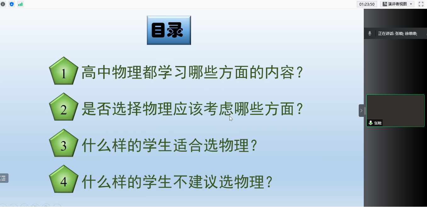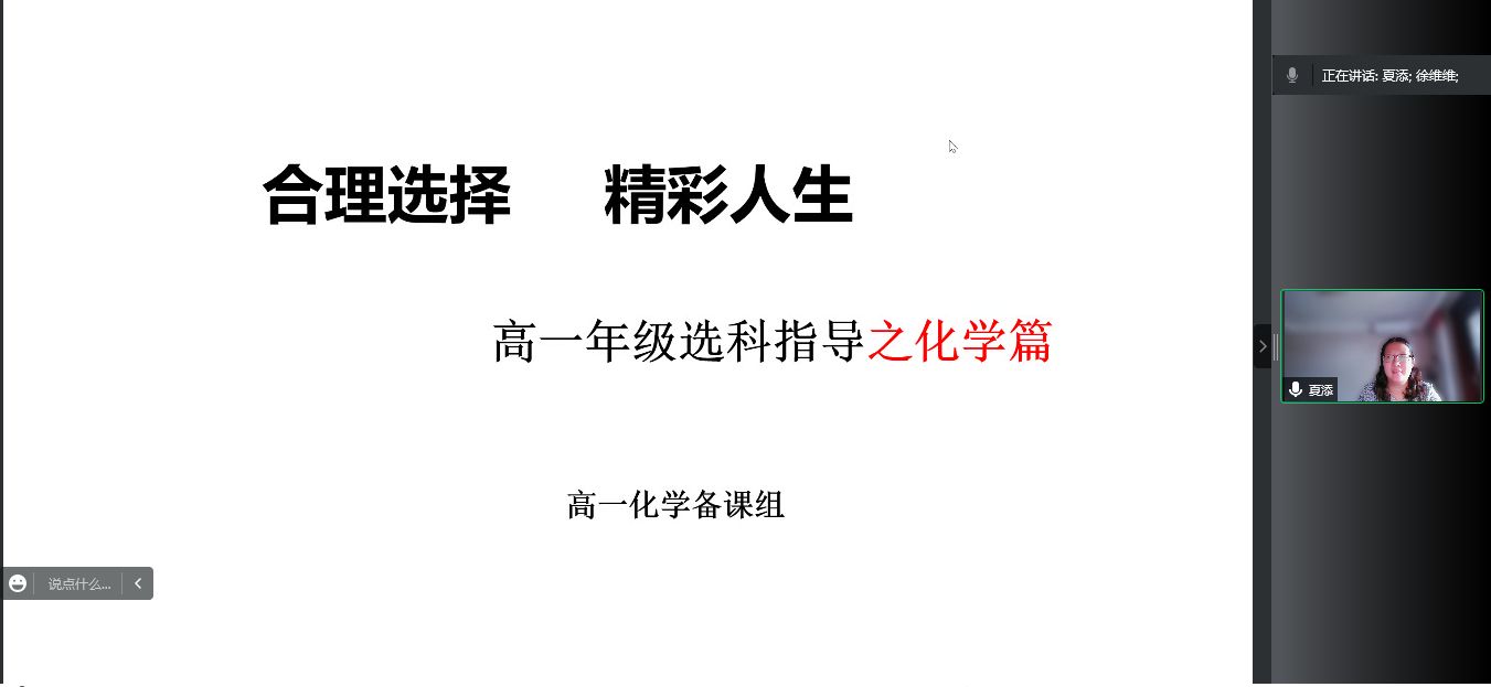6位学科教师向学生们介绍了本学科高二、高三的学科发展要求、高考相应的知识和能力要求、大学专业对口的要求及各学科未来的学习建议等方面内容,多角度指导学生选科。