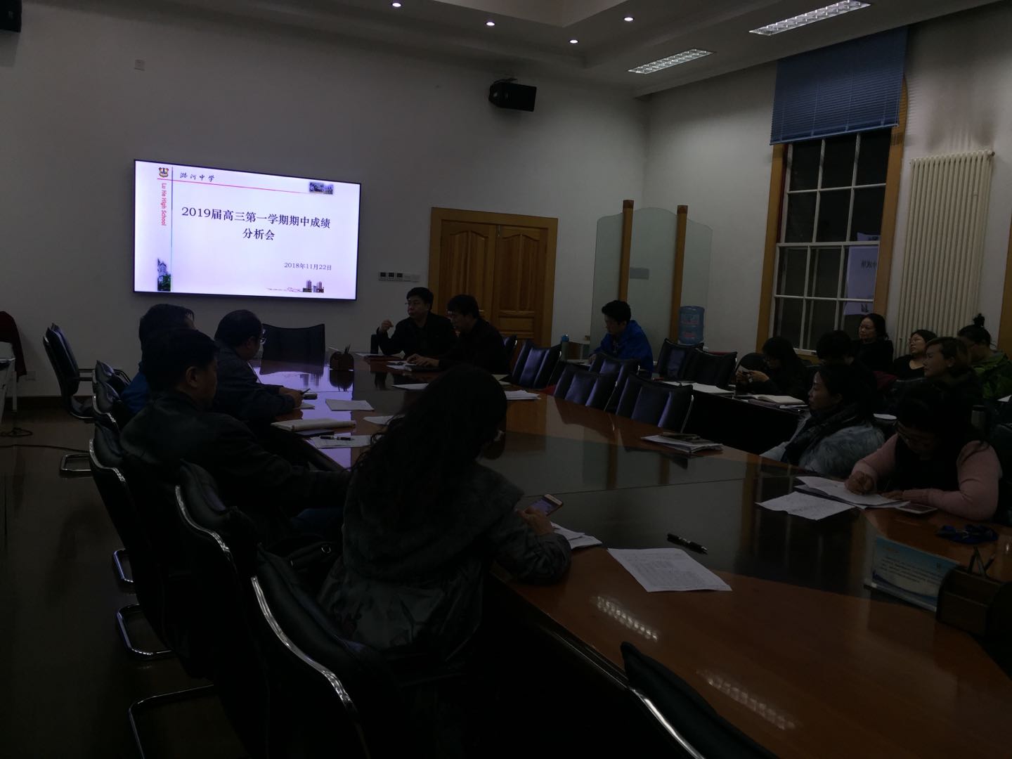 2018年11月22日下午,高三年级召开期中考试成绩分析及期中总结会,全体高三教师及高三领导小组参加,会议由高三年级主任梁莹莹老师主持,高考9个学科备课组长从本学科考试目标落实情况、目前教学中存在的问题、提分改进的具体措施等方面做了简短发言,既肯定了教学中存在的优势,也分析了尖子生优势不足、学困生压力很大等问题以及今后努力的方向。高三4班刘柳、高三12班任亚群、高三13班姚兰、高三14班马春4位班主任从本班高分学生和边缘生目前状况以及尖子生的弱势学科等方面分析了学生从本次考试中暴露出的问题。