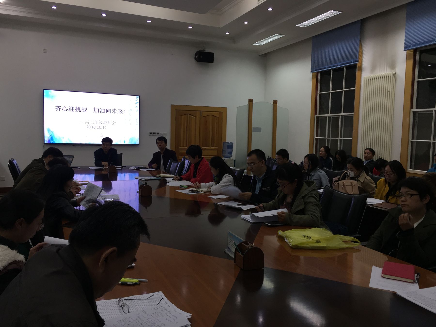 2018年10月11日下午,高三年级召开全体教师会,会上分析了本次高三月考成绩、落实本届高三高考目标、对前一阶段高三复习进行了总结并对接下来的学生分类推进和尖子生提高补弱等工作做了部署,徐华校长、祁京生副校长、和教学处毛燕宁主任出席了会议。