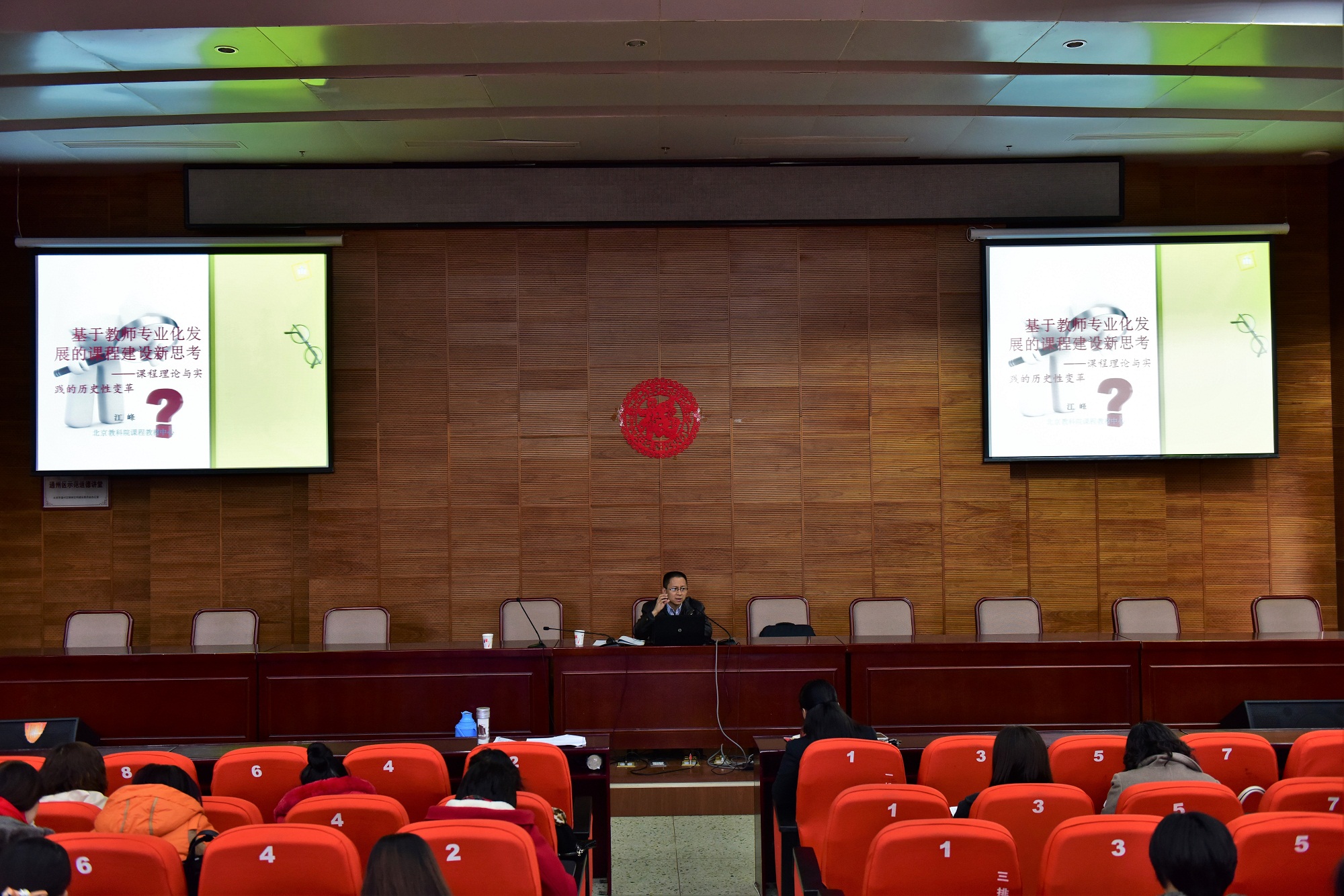 江峰主任结合目前的北京市课程改革的形式,结合当前课程建设的新理念从三个方面展开:一、回到原点:课程与校本;二、关注人本:教师专业发展; 三、二者勾连:校本课程开发。