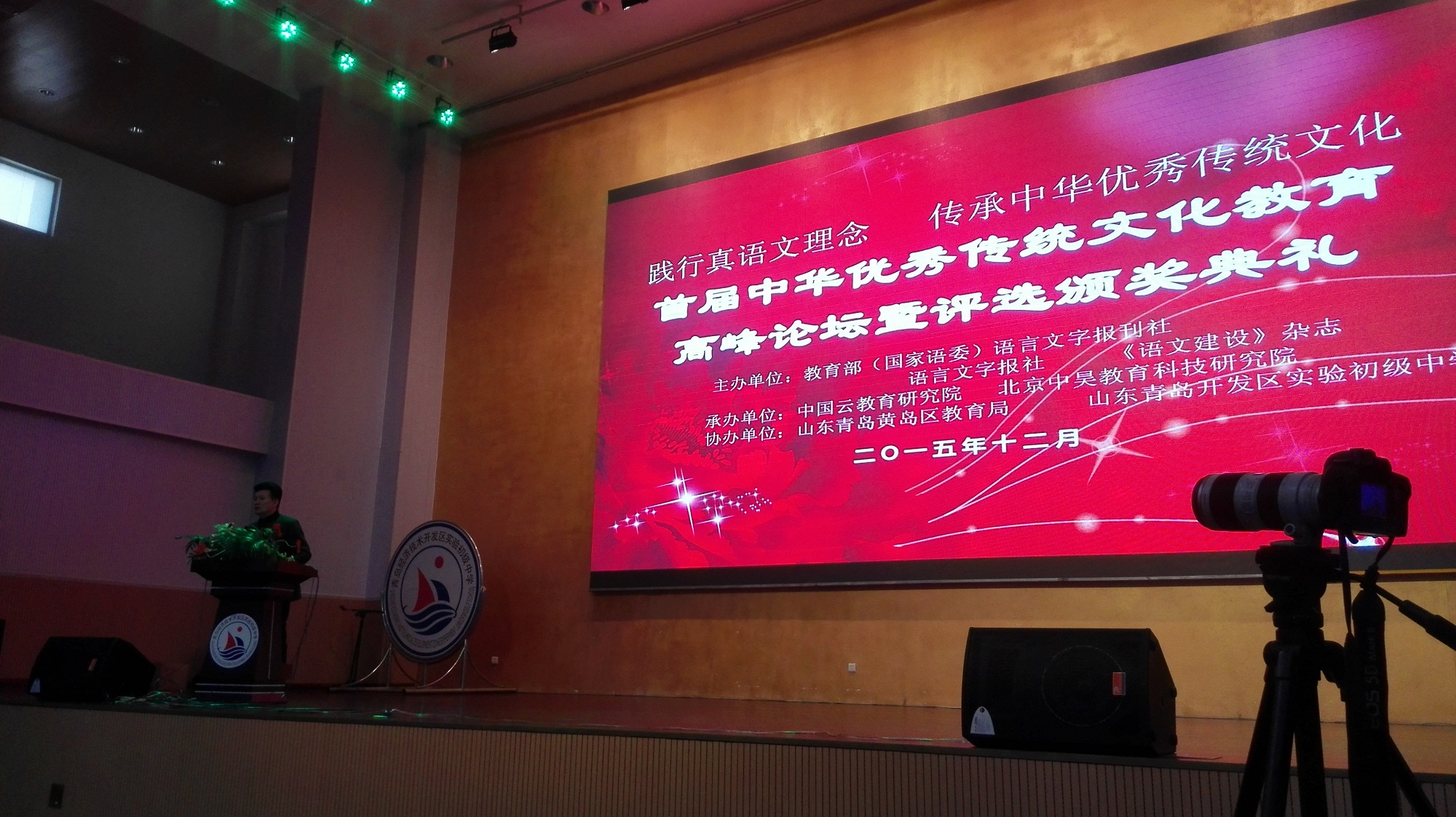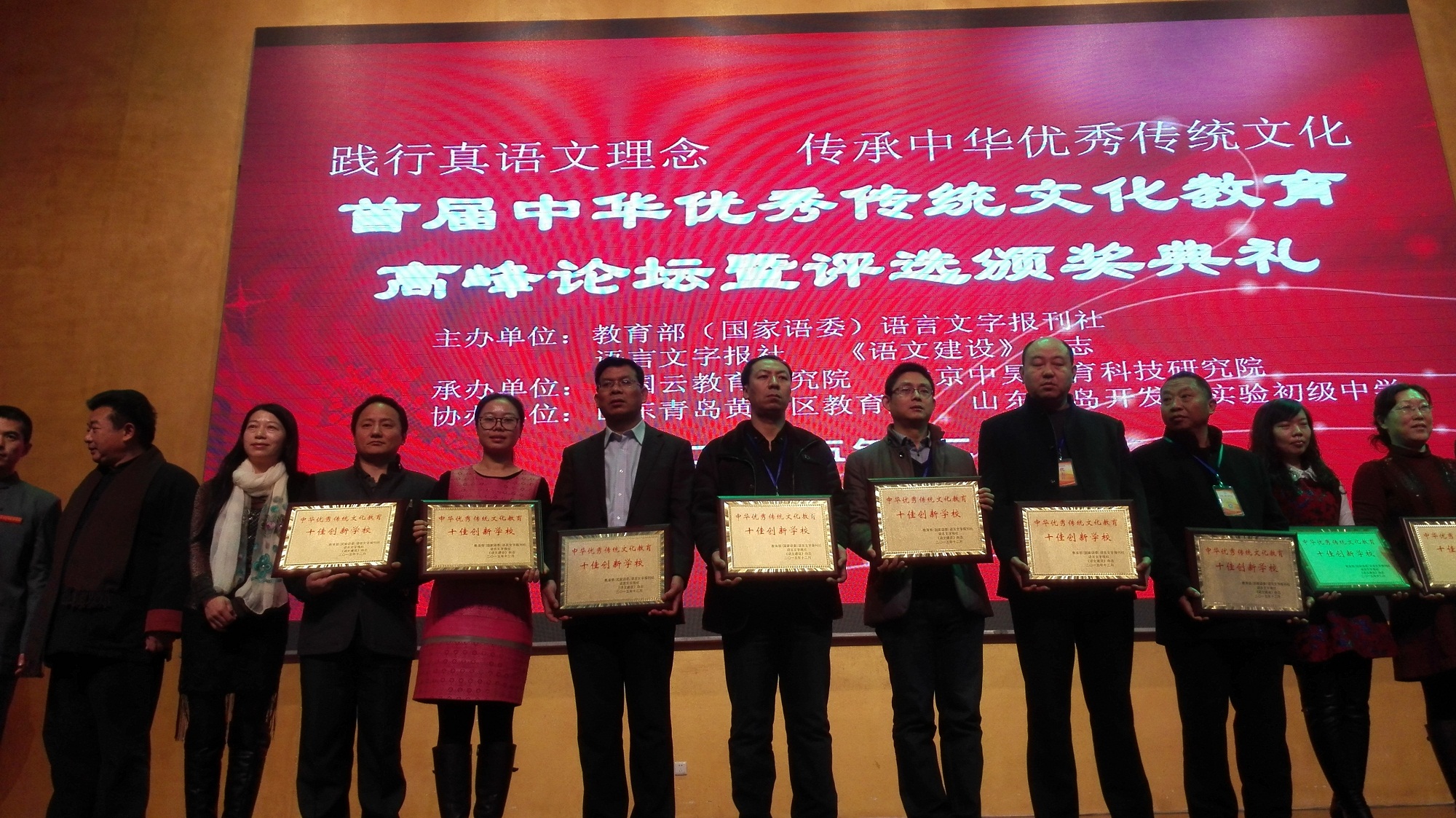 12月12日——14日在山东青岛举行了“首届中华优秀传统文化教育高峰论坛及评选颁奖典礼”。此次活动由教育部(国家语委)语言文字报社、语言文字报社和《语文建设》杂志主办,山东青岛经济技术开发区实验初级中学承办。活动主题为“践行真语文理念,传承中华优秀传统文化”,来自全国各地的两百多个单位和学校参加了此次活动。