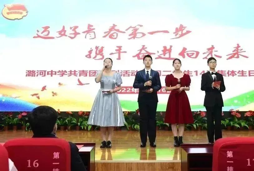 11月16日,“迈好青春第一步 携手奋进向未来” 潞河中学共青团系列活动之初二学生14岁集体生日在第一报告厅隆重举行。徐华校长、谢宏春副校长、李晨松副校长、宋久峰主任、王雷副主任、团委徐甲书记、敦帅副书记,还有家长代表初二8班管兆轩同学的妈妈赵丽佳女士,共同见证了同学们青春旅程中的重要时刻。