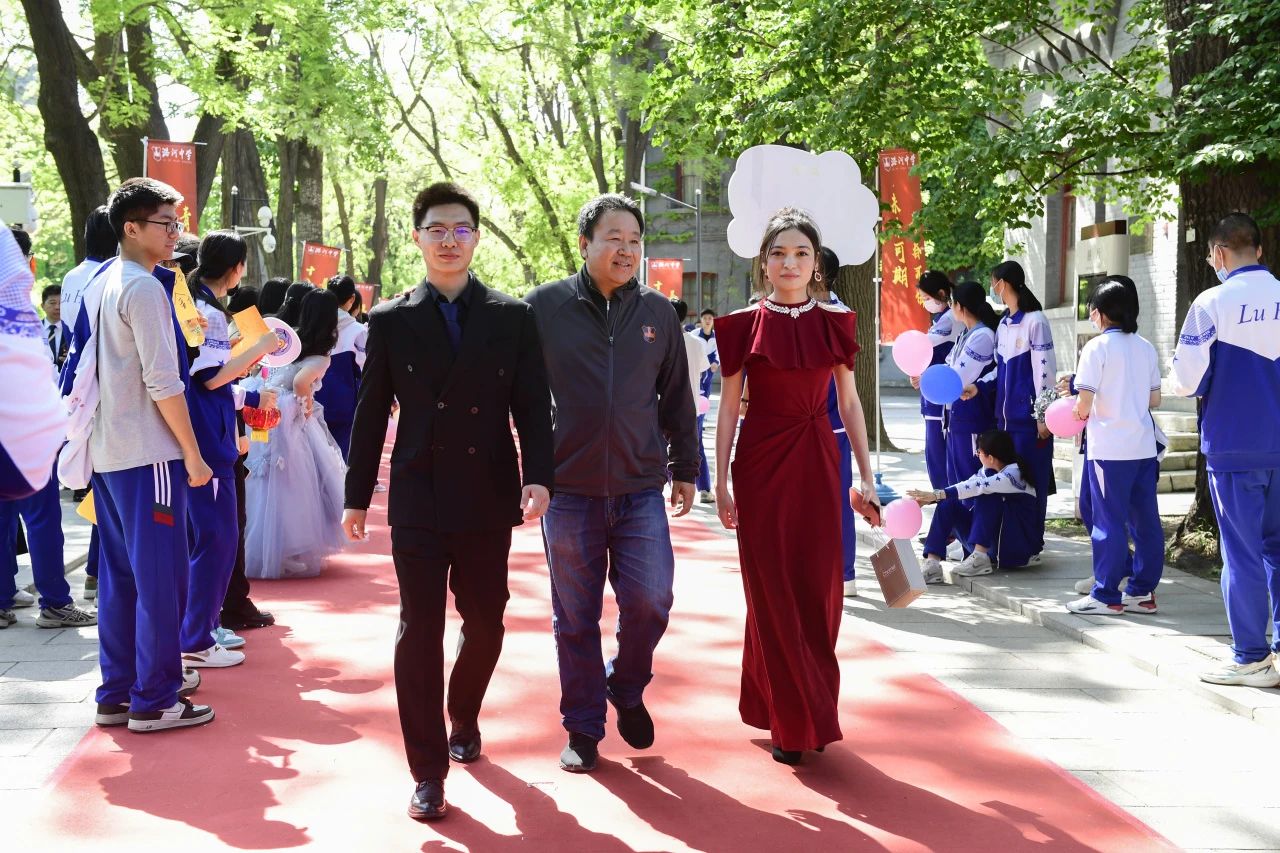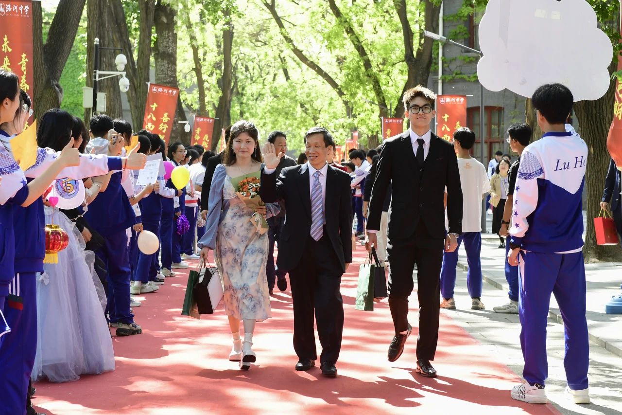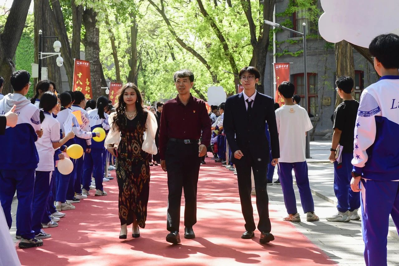主甬路上,写有十八岁寄语的旗帜迎风飘扬,红毯从天钦楼延伸到成人门,寓意着同学们一路走过稚嫩的孩童时期、懵懂的少年时期,终于迎来18岁。高三学子身着正装、礼服,在父母师长的陪伴下,英姿飒爽、精神抖擞地走过红毯,祝愿18岁的你们,未来可期!