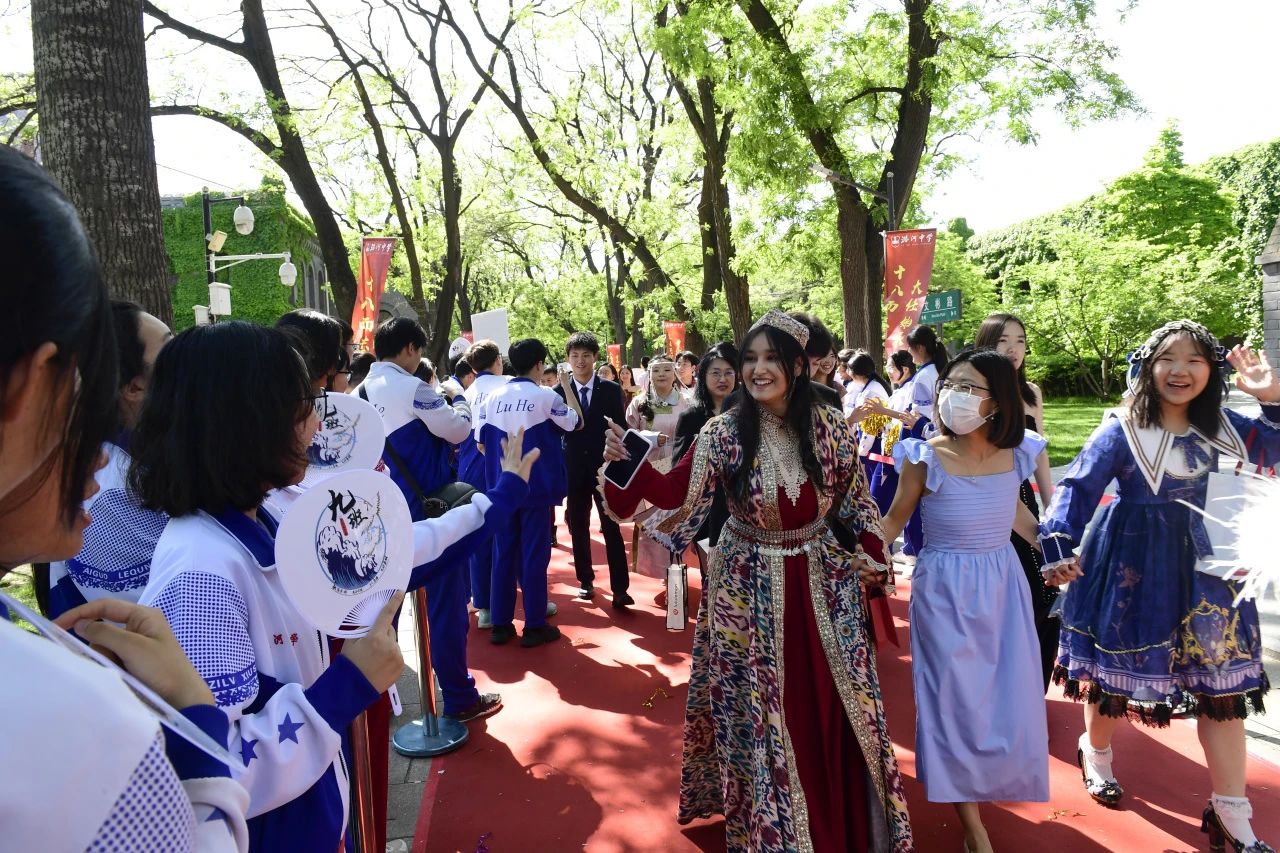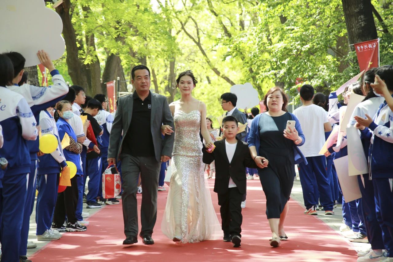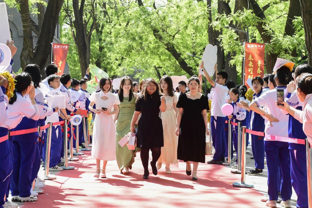 主甬路上,写有十八岁寄语的旗帜迎风飘扬,红毯从天钦楼延伸到成人门,寓意着同学们一路走过稚嫩的孩童时期、懵懂的少年时期,终于迎来18岁。高三学子身着正装、礼服,在父母师长的陪伴下,英姿飒爽、精神抖擞地走过红毯,祝愿18岁的你们,未来可期!