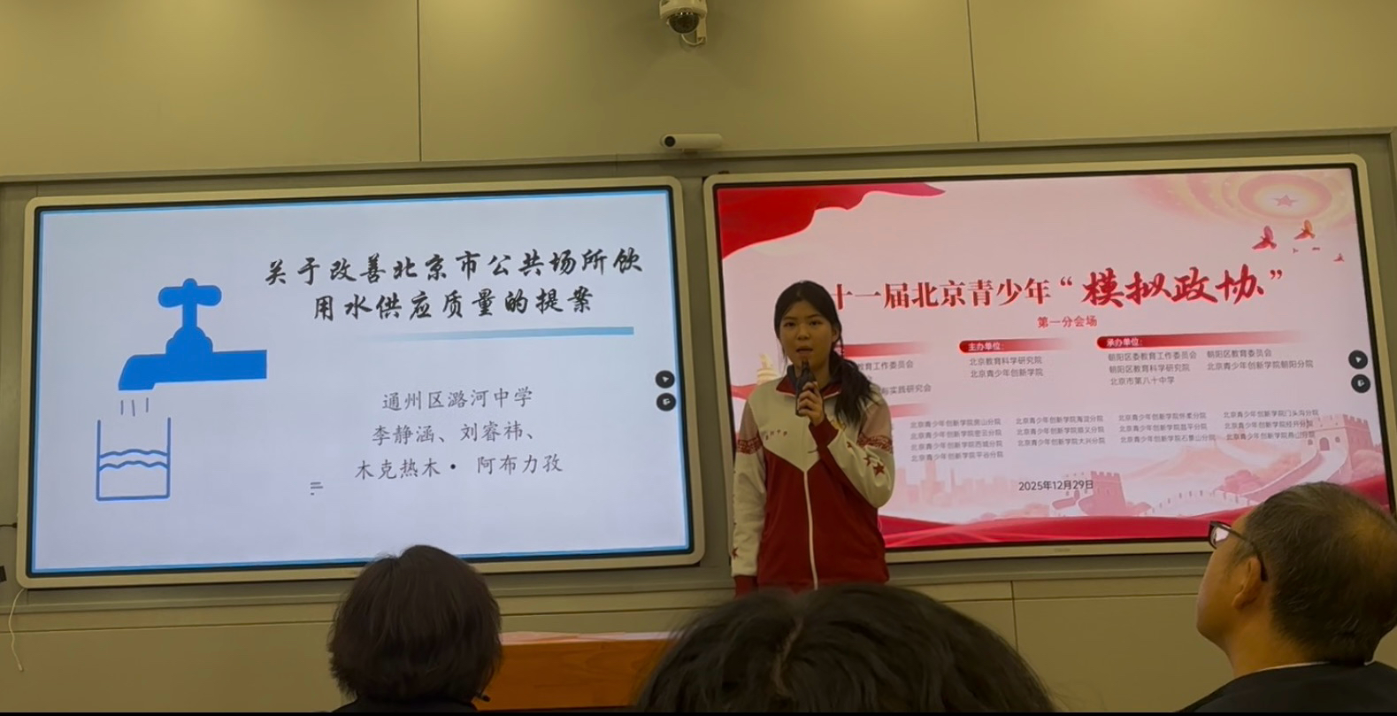 线上观摩的深刻感悟离不开模拟政协活动的实践与积累。在 “青春建言 共谋未来” 2025 年北京市青少年模拟政协提案征集活动中,潞河中学模拟政协社团的同学们聚焦民生热点与社会发展,经过深入调研共上交 17 份高质量的模拟政协提案,涵盖教育、环保、公共服务等多个领域,每一份提案都凝聚着同学们的思考与智慧。2025年12月29日,高二(11)班李静涵作为代表带着和小组成员刘睿祎、木克热木三位同学共同撰写的《关于改善北京市公共场所饮用水质量的提案》参加了第十一届北京青少年“模拟政协”活动现场展示。2026年1月5日,潞河中学模拟政协社团师生现场观摩政协北京市通州区第七届委员会第五次会议开幕会,上了一堂沉浸式感受全过程人民民主的“大思政课”。