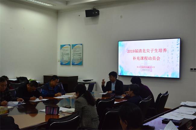 在会议上,徐华校长点明尖子生培养是潞河中学重中之重的教学任务,是潞河中学义不容辞的责任。祁京生副校长回顾了2018届尖子生培养过程中采取的有效措施,并布置2019届冲击清华北大尖子生培养补充课程任务。在2019届尖子生培养中,我校除了为高三年级配备高水平教师,还将抽调其他年级市区骨干教师、学科带头人为尖子生提供专门课程,辅导答疑。此外,我校将聘请北京市高水平学科专家为尖子生提供讲座指导。
