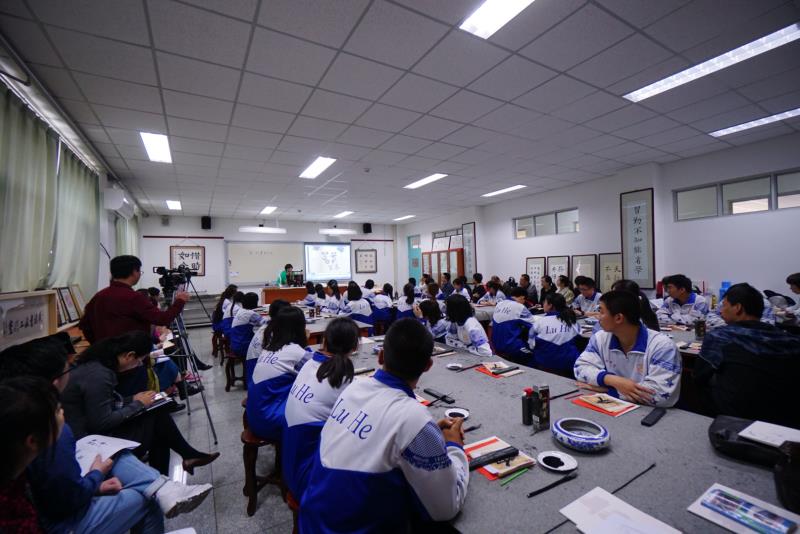 2018年4月20日上午,市区专家及书法教师近40余人走进我校吴琳老师书法工作室,共同研讨高中书法课程教学。