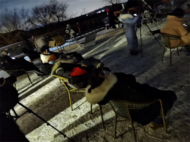 一场突如其来的冬雪让老师和同学们临时调整了计划,决定先观雪,再观星。13日凌晨零点半的时候,雪停风来,正是观测的绝好时机。同学们兴奋地架好望远镜、摄影设备,按照计划开始观测。这边正听到天文社的刘佳鑫同学给大家讲解着冬季星座,那边又传来一阵欢呼,是刚刚有流星划过天际。双子座流星雨果然流量很大,在短短的一两个小时时间内很多同学都数到了十几甚至几十颗流星,惊叹不绝。在欣赏了美丽的流星雨之后,同学们聚集在望远镜前,开始了对深空天体的观测和拍摄,有的同学忘我地拍摄到凌晨三四点钟。对于天文的热爱和专业令人赞叹。
