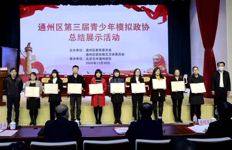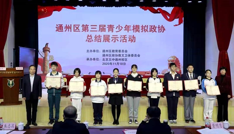 11月18日上午,通州区第三届青少年模拟政协总结展示活动在北京五中通州校区举行。我校模拟政协社团任芃宇、王雨桐等25位同学提交的11份模拟提案分别获高中组、初中组“优秀模拟提案奖”,田娜等3位老师获“优秀指导教师奖”。