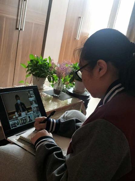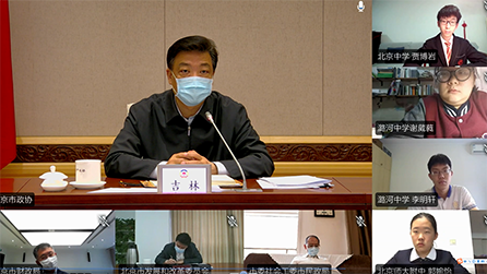 在新冠肺炎疫情期间,我校模拟政协师生积极建言献策,提交的模拟提案《关于发挥基层力量,在群众中推进传染病宣传工作的提案》《关于提高基层新冠肺炎防控能力的建议》受到好评。2020年5月8日上午,模拟提案撰写者王子祎、陈雨萱、谢葳蕤、李明轩同学和蒋真铮老师再次受邀全程在线观摩“健全公共卫生机制,推进健康北京建设”市政协年度提案办理协商会。其中谢葳蕤、李明轩两名同学受邀进入主会场屏幕全程观摩会议。