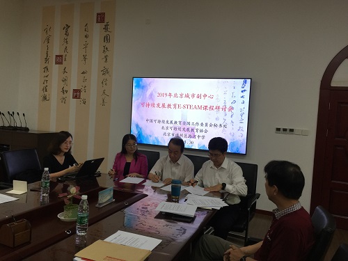 2019年5月30日下午,2019年北京城市副中心可持续发展教育E-STEAM课程研讨会在潞河中学召开。北京教科院终身学习与可持续发展教育研究所所长史枫、中国可持续发展教育全国工作委员会执行主任史根东、中国可持续发展教育全国工作委员会地区和学校指导部部长崔静平、北京教科院终身学习与可持续发展教育研究所副所长王巧玲,潞河中学校长徐华、副校长祁京生、教学主任毛燕宁以及参加此项目研究的22位教师参会。
