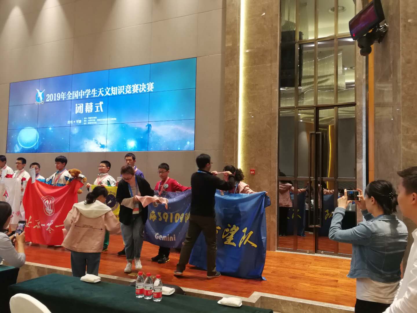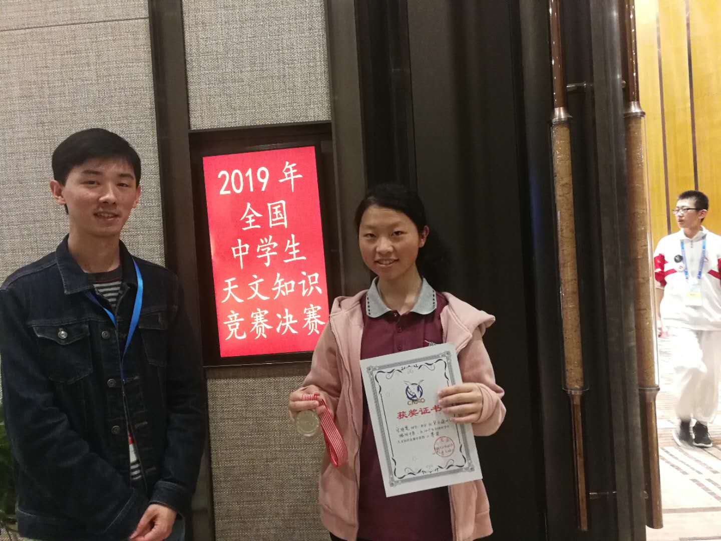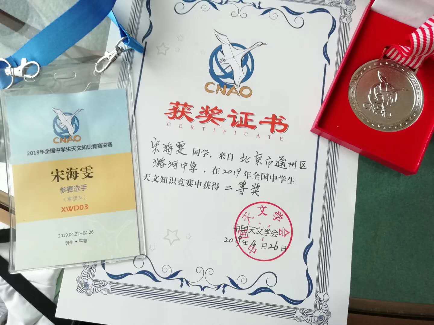 2019年4月22日~26日,2019年全国中学生天文知识竞赛(决赛)在贵州省黔南州平塘县“天眼(FAST)”所在地隆重举行。此次预赛高低年级共3024人参加,174人进入决赛,决赛设有一、二、三等奖和鼓励奖,其中一等奖9人,二等奖22人,三等奖37人。我校高二年级宋海雯同学荣获二等奖。