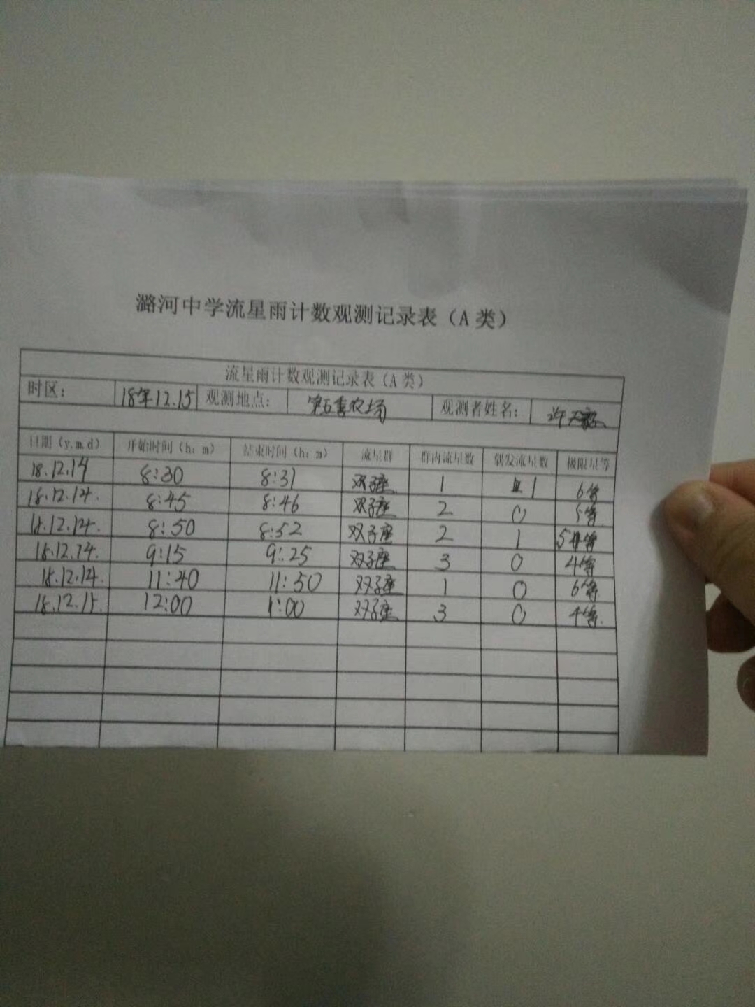2018年12月14~15日,潞河中学金鹏天文团和摄影社携潞河中学联盟校、手拉手校在通州区第五季农场开展了双子座流星雨观测实践活动。北京市天文馆寇文老师、东城区科技馆王萌老师亲临现场指导,中山街小学、潞河中学附属学校、北京二中通州校区、人大附中通州校区等联盟校、手拉手学校参与此次观测活动。本次活动由潞河中学教学处李丽副主任、赵哲嵩、杨海涛、赵芳、陆畅、孙航老师,中山街小学毛德福老师,潞河附属学校余鸿志老师,北京二中通州校区吴嵬老师,人大附中通州校区王娇娇老师带队,共70余名师生参与。