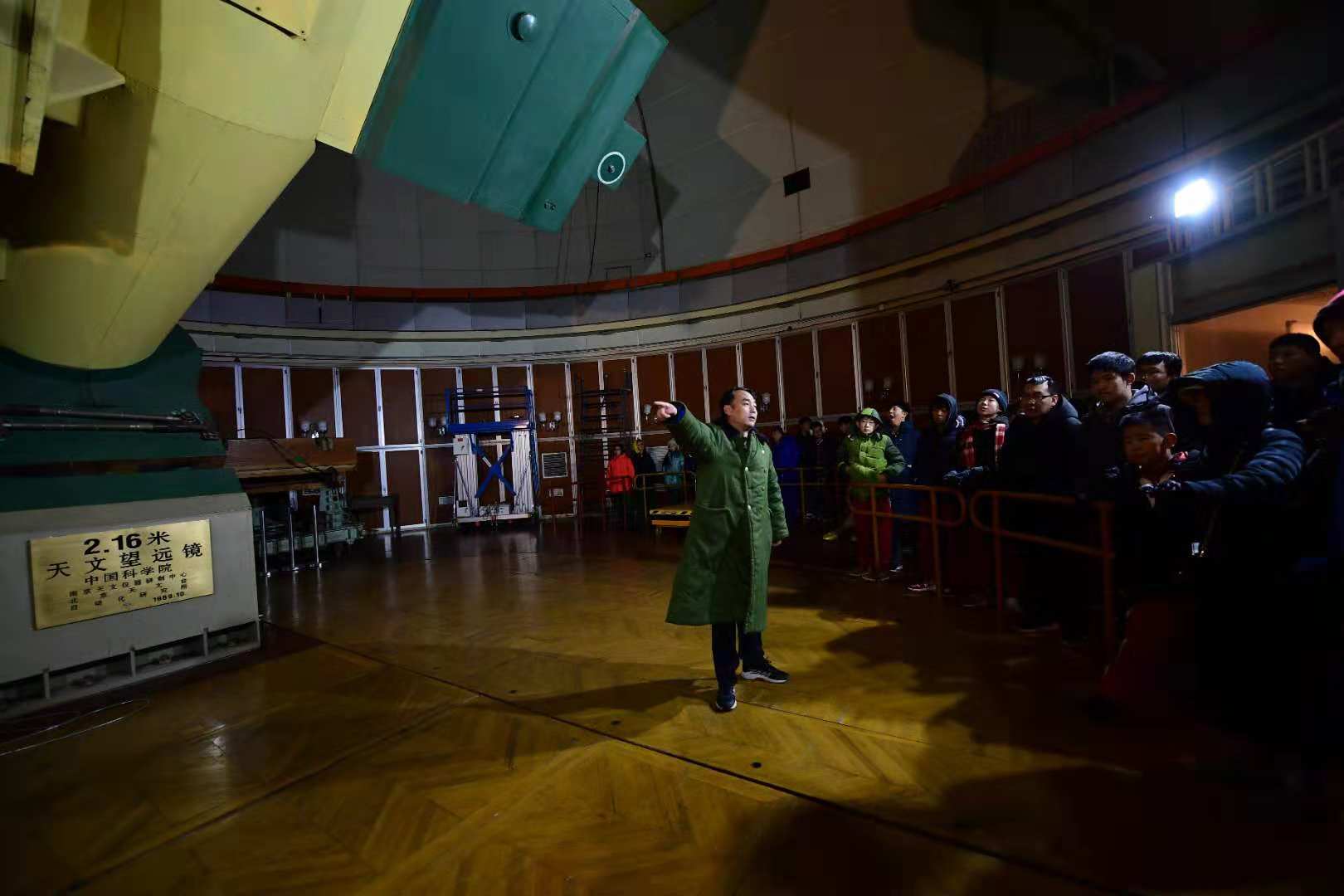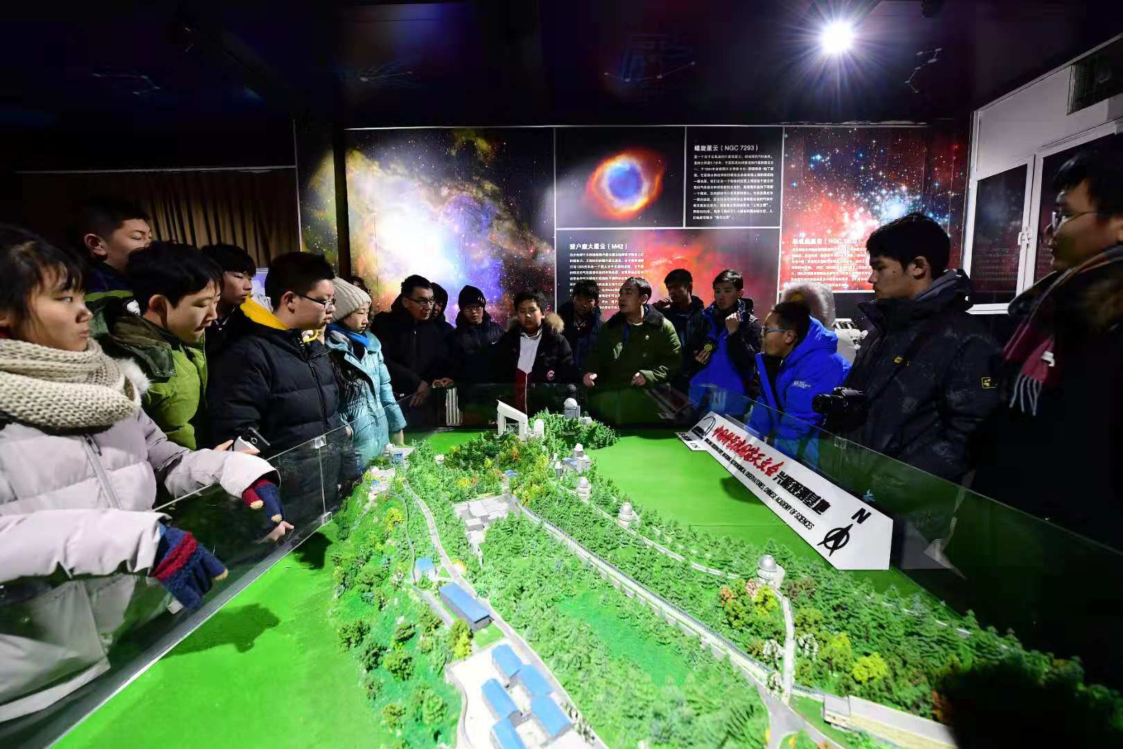 8日上午天文台工作人员为师生们安排了精彩的国家天文台兴隆站讲解:天文站郭老师在展厅为我们首先介绍了我国目前的天文台分布状况,之后结合兴隆站沙盘详细介绍了本站发展历史及现有在用望远镜,最后结合展示实物就2.16米光学望远镜、郭守敬望远镜(LAMOST)的基本工作原理和价值进行了介绍:“2.16米”光学望远镜在1989年建成,填补了毫米波与VLBI(甚长基线干涉仪)天文的空白;LAMOST的建成,是中国望远镜制造史上的里程碑——世界上口径最大、光纤数最多的大视场光谱巡天望远镜。参观展厅后,全体师生实地参观了2.16m反射望远镜和郭守敬望远镜,并利用专用望远镜观察太阳。
