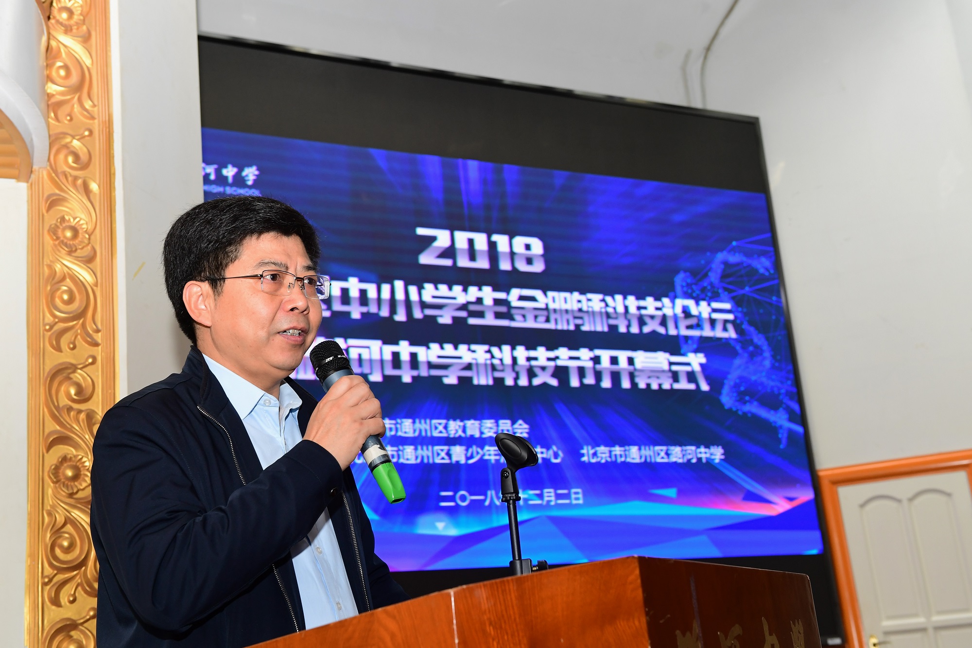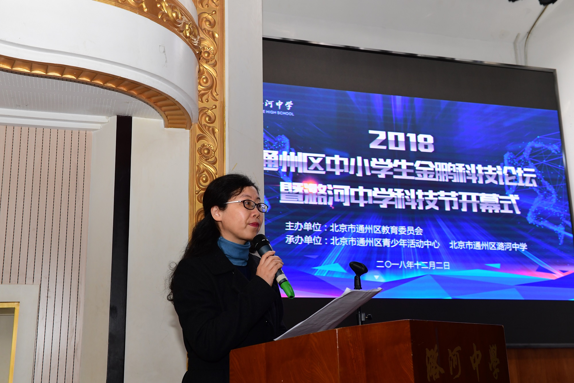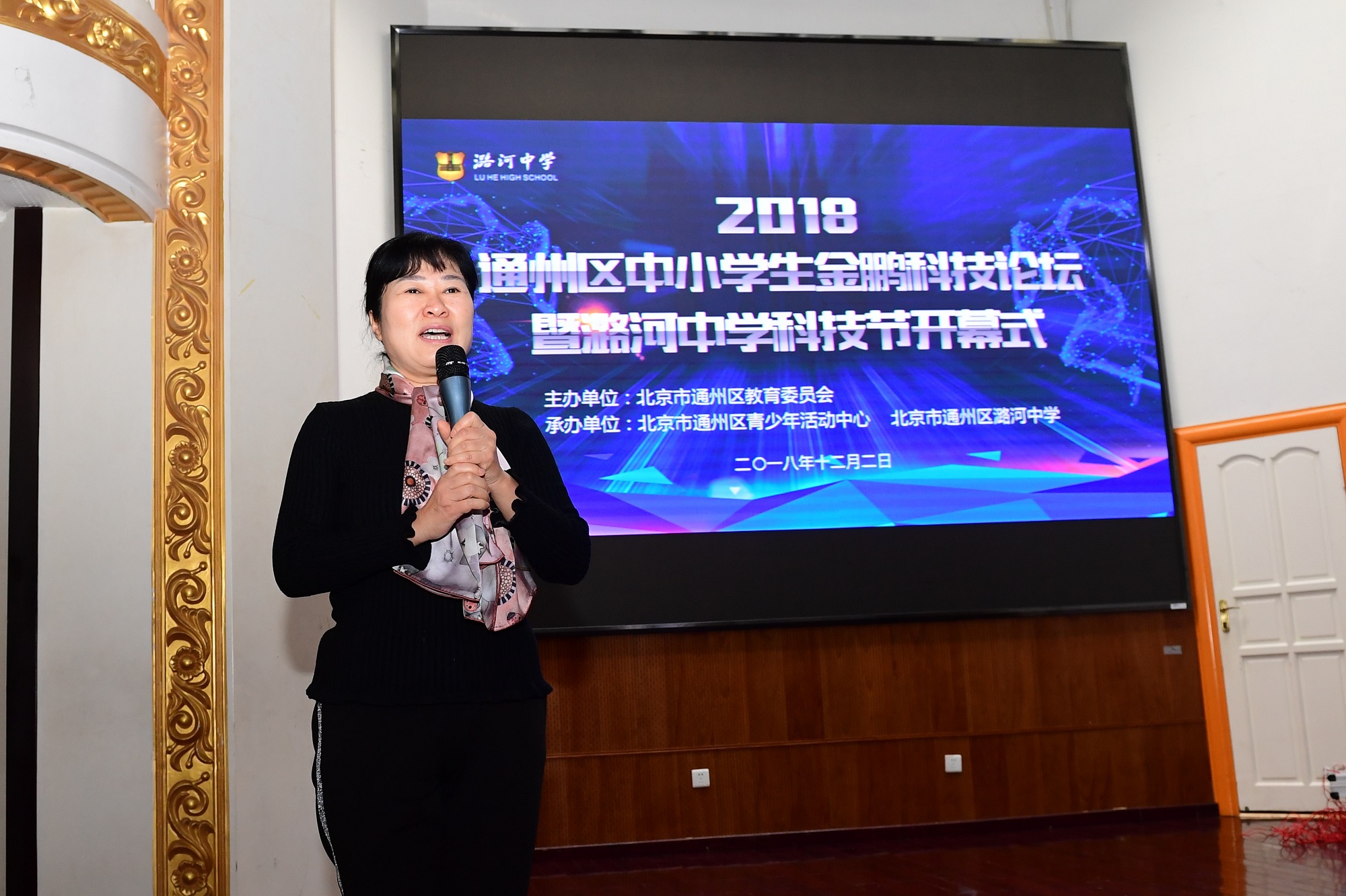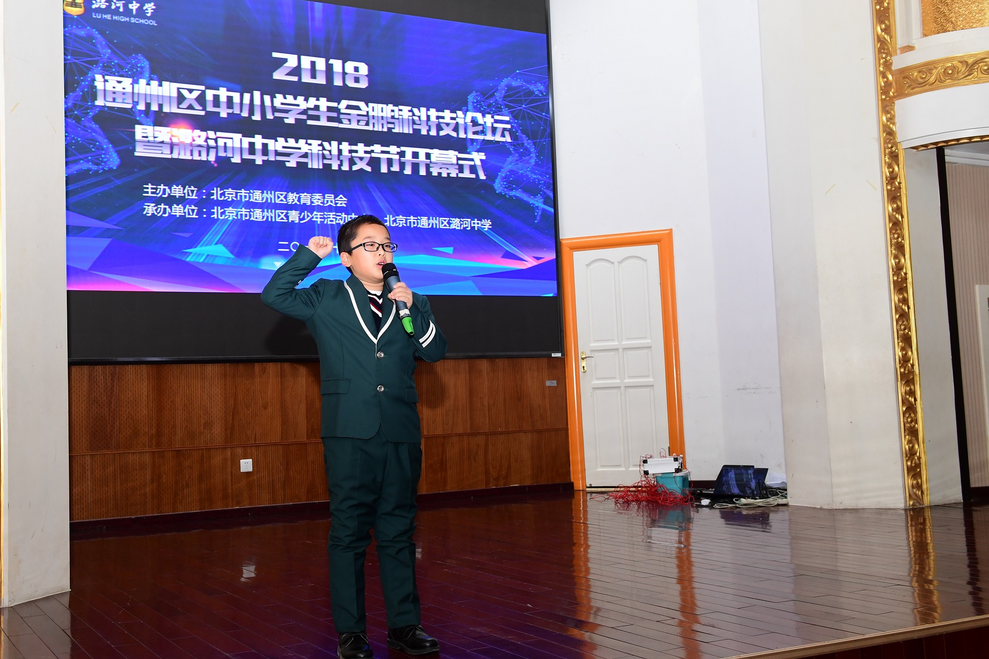 金鹏科技论坛暨潞河中学科技节开幕式由潞河中学教学处毛燕宁主任主持;徐华校长在开幕式中致辞:徐校长介绍了潞河中学科技教育的发展历程,并郑重宣布,潞河中学的全部科技教育资源向通州区所有学校开放。
