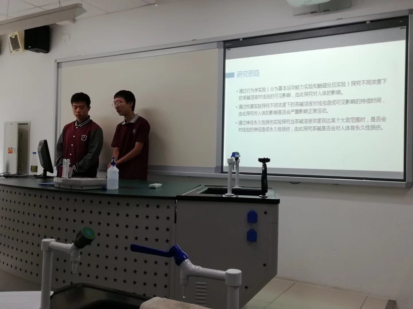 活动的第二阶段是学生创新课题的开题报告和专家点评指导。贯通年级和高一年级分别汇报了13个和10个课题。同学们在讲台上大方得体,表达清晰,观点明确、逻辑严谨,在接受教授和其他同学质疑时能镇静自若从容辩护,展现了深厚的文献阅读积累和对课题的深入严谨的思考。王香名教授对同学们课题的新颖性和实验方案的严谨性给予了高度评价,并对同学们在台上表现出的自信和专业大加赞赏。王教授主要对每个课题从选题的新颖性、方法的可行性、逻辑的严谨性、数据的可靠性等方面进行个性化指导,同学们收益匪浅。其中,《用秀丽隐杆线虫作为模型探索痛风的治疗》、《探究污水中六氯苯对秀丽隐杆线虫神经行为和繁殖能力的影响》、《探究十二水硫酸铝钾对秀丽隐杆线虫学习行为和繁殖能力的影响》、《双酚S对秀丽隐杆线虫毒性效应的研究》、《紫外线照射对秀丽隐杆线虫子代存活率和形态学的研究》、《长期服用安眠药对亲代线虫学习能力和子代线虫学习能力遗传效应的影响》等课题被评选为优秀课题。同学们展现出的自信和专业恰恰是潞河中学一贯提倡和实施的诸如“贯通年级假期中科院南京水生生物研究所调查研究”、“翱翔计划”等特色课程或深度参与课程对同学们长期的培养和浸淫的体现。