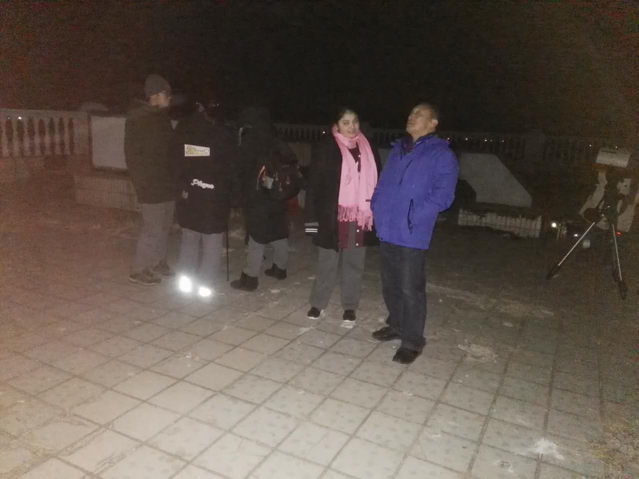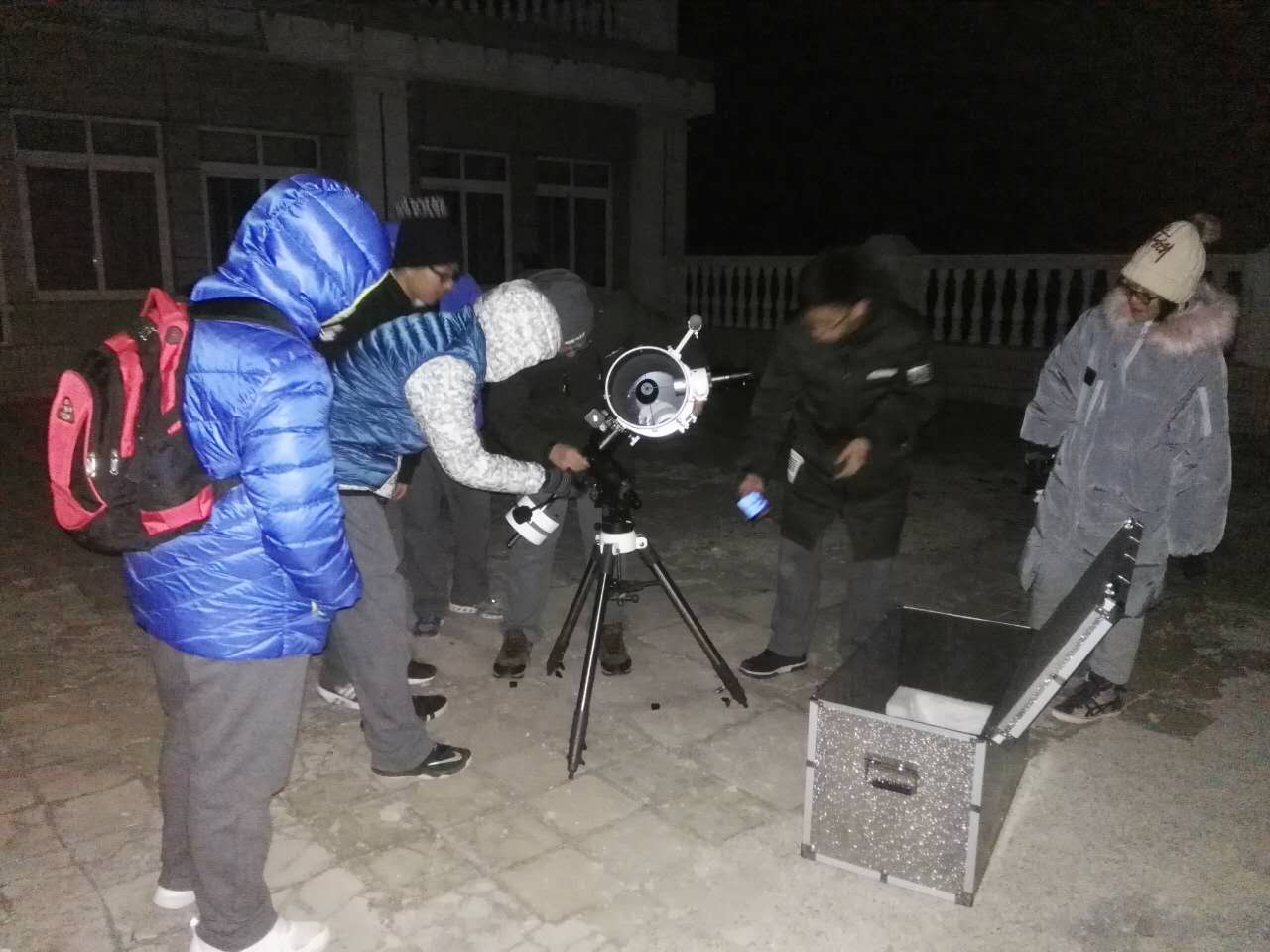 当天潞河中学由魏海楠主任、赵哲嵩、陆畅、吴文君老师带队,北京二中通州分校由吴嵬老师带队,台湖学校由陈新征老师带队,三所学校的60多名师生分两批开赴延庆。活动开始以后首先由贾贵山老师为大家讲解冬季星空以及流星雨相关知识,幸运的是贾老师每讲一块天区就会有一颗流星划过,其中还有一颗火流星,引得学生们阵阵欢呼,更加激发了大家的观测热情。随后贾老师对一些有疑问的同学进行了耐心的讲解,尤其是得知热汗古丽同学来自新疆以后,贾老师非常热情的给她介绍了丰富的星空知识。其他的同学分别开展了观测活动,我校天文社带了四架不同型号的望远镜供同学们观测,北京二中通州分校利用一架比赛用镜进行了找寻天体目标的练习,台湖学校用自带的折返镜观测深空天体。潞河摄影社的学生利用自带器材练习天文摄影。