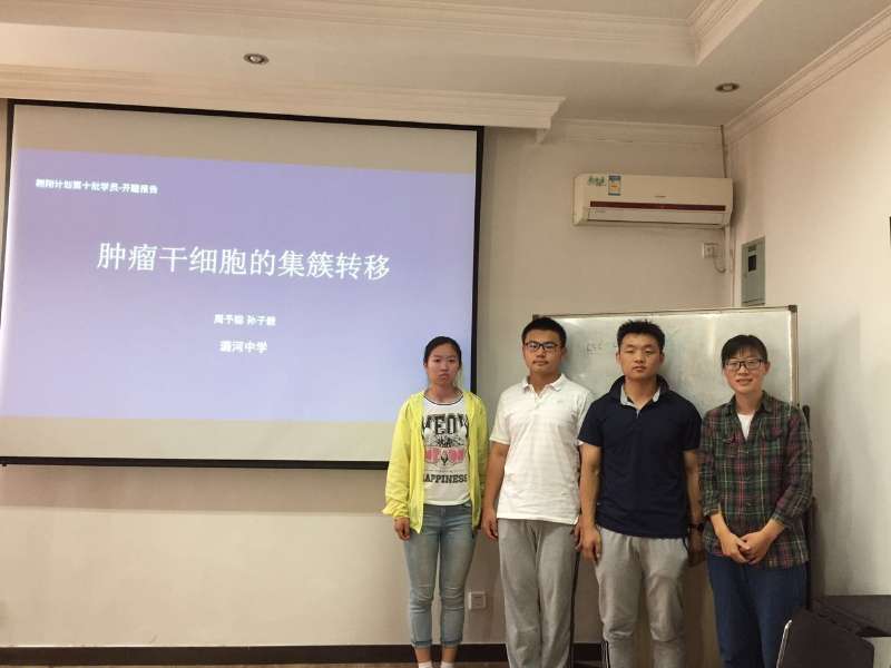2017年6月11日上午,由北京大学和潞河中学联合培养的两名翱翔学员在北京大学重离子物理研究所408会议室进行了开题报告会。北京大学的杨根副教授、权强华老师;我校李娟老师参加此次开题报告会。会议由杨根副教授主持。第十批翱翔学员周予聪、孙子毅汇报了自己的科研课题《肿瘤干细胞与集簇转移的初步研究》。杨根副教授对他们的工作给予了肯定,也指出不足的地方,并就不足给两位学员进行了细致的讲解。杨老师给与会人员详细介绍了科学研究的方法,进一步强调只有经过系统化训练的才称得上科学家,否则只能称为民科。科学研究必定是一个漫长的过程,守得云开见月明。