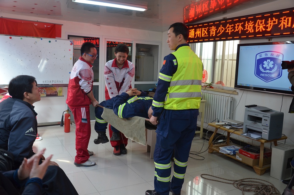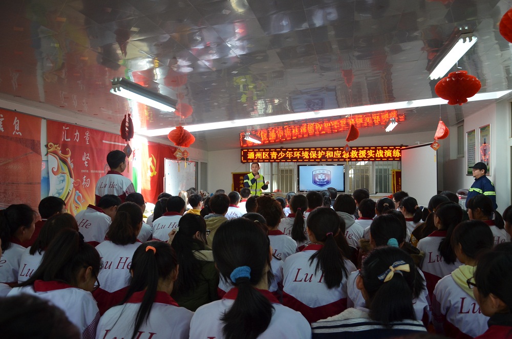 3月11日下午,我校高一年级学生志愿者参加了通州区青少年运河环境保护志愿者应急救援培训演练活动。区科协主席金文岭、区消防协会秘书长田瑞宗、果园西社区书记兼主任李玉荣等参加了活动。我校科研处李丽副主任、团委柏慧老师、周本军老师、谷伟凤老师带领近80名学生志愿者走进果园西社区,向社区居民宣传环保观念并共同进行应急救援实战演练。
