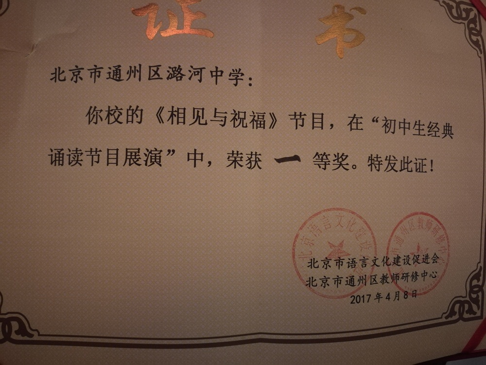 4月8日上午,我校初二年级学生在“2016——2017学年度京津冀初中生经典诵读节目展演大赛”中表演的《相见与祝福》,经专家评委现场打分,以97分的优异成绩,从15支参赛队伍中脱颖而出,获得展演比赛一等奖第一名!