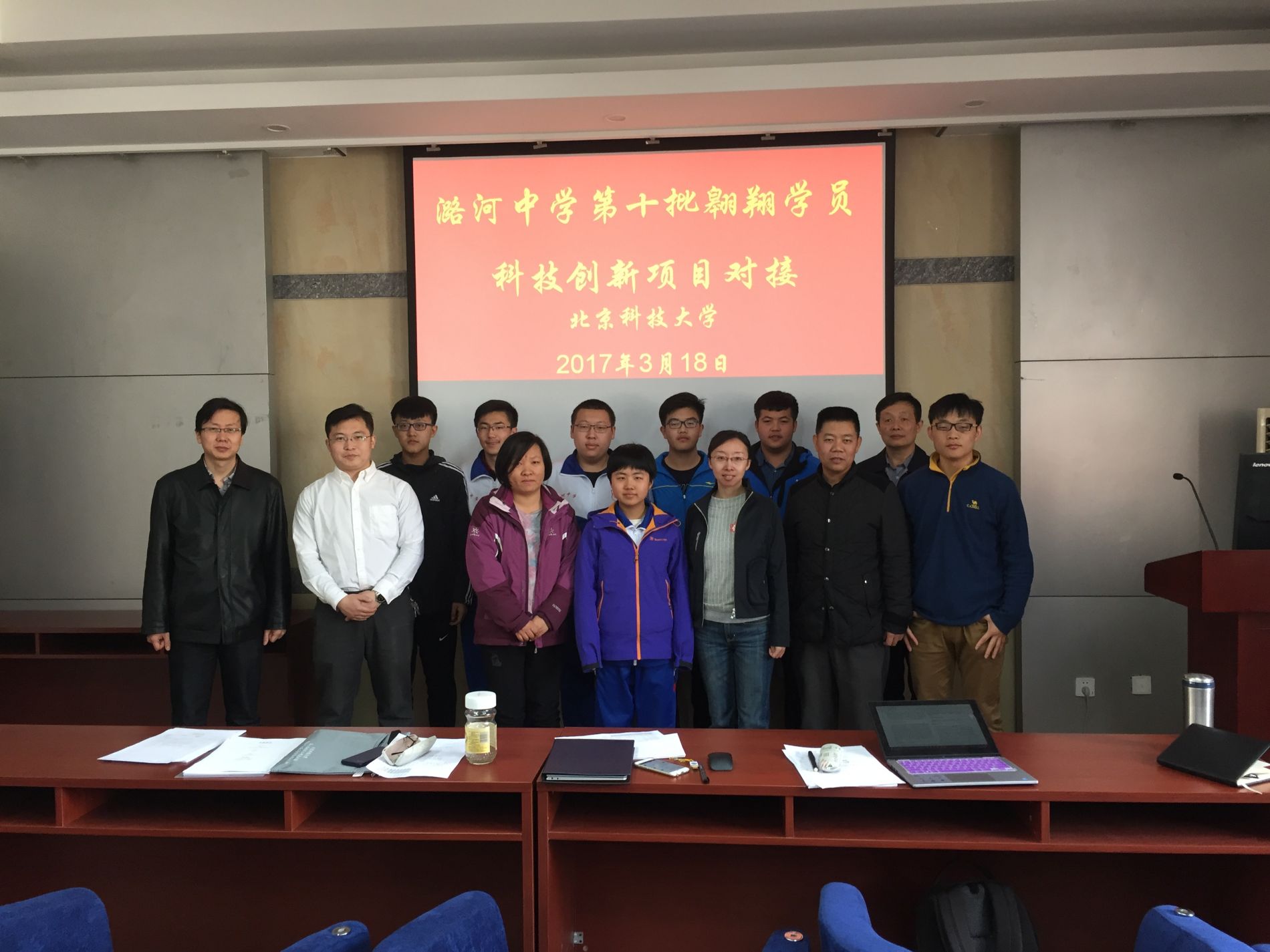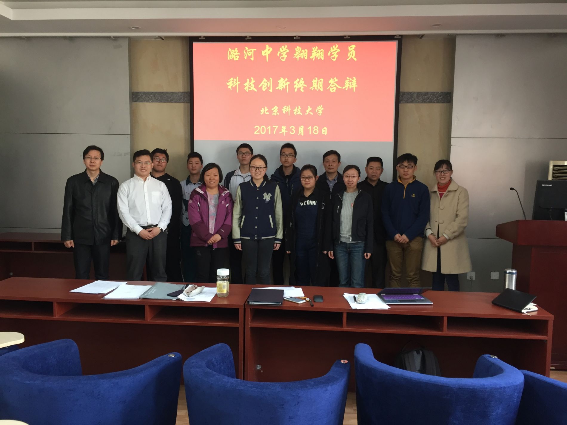 2017年3月18日上午,由北京科技大学、北京大学培养的我校第九批7名翱翔计划学员和第十批10名翱翔学员在北京科技大学理化楼401进行了结题和对接活动。北京大学的权强华老师(博士),北京科技大学的陈章华教授,陈森老师,张师平老师、孙明明老师,王立锦老师,我校刘亚茵老师,高琳姝老师,李娟老师和生源校指导教师北京二中亦庄学校吴宇鹏老师参会。结题和对接由北京科技大学陈章华教授主持。