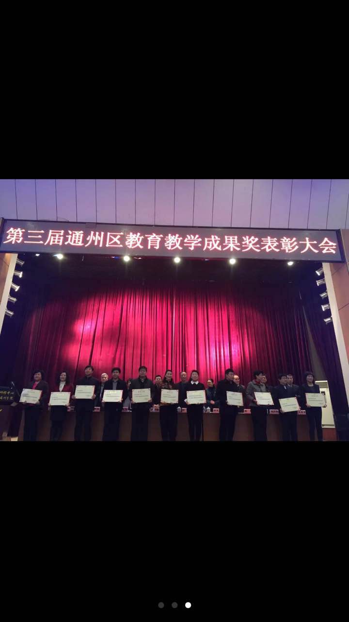 2015年11月25日上午,第三届通州区教育教学成果奖表彰大会隆重召开。北京高等教育学会常务副会长兼秘书长、北京教育科学研究院原院长时龙,北京教育科学研究院院长方中雄,通州区人民政府副区长李亚兰,通州区教委主任张绍武、副主任王秀东等领导专家,以及通州区各中小学、幼儿园,职业学校,成教中心,北工大实验学院,各直属单位等学校领导、教师参会。