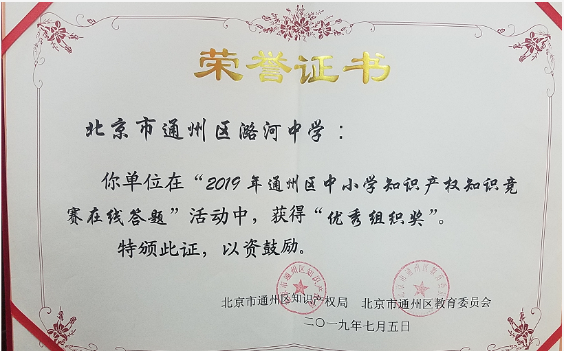 潞河中学作为知识产权市级示范校,积极响应通州区知识产权局和通州区教委的精神,落实“知识产权”进课堂,积极普及知识产权知识,潞河学生在2019通州区中小学知识产权知识竞赛在线答题活动中表现突出,获得“优秀组织奖”。