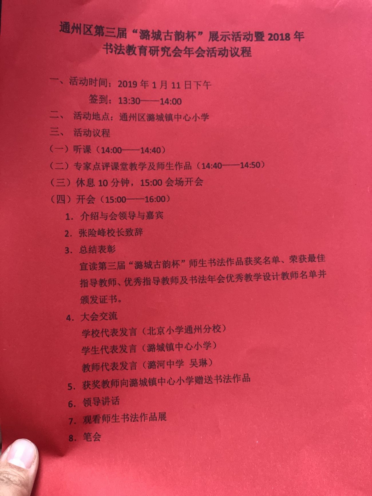 此次活动由通州区教育系统关工委、通州区教育学会书法教育研究会和通州区潞城镇中心小学共同主办。出席此次活动的有通州区关工委常务副主任王雅岚、通州区教育督导室主任李少杰、通州区关工委副主任肖金茹、通州区教委小教科科长商学丰、通州区教委小教科孙亚桂老师、通州区教师研修中心主任李万峰、市区两级政府督学肖宝军、通州区教育关工委副主任王德华、通州区教育学会会长刘殿金、通州区教育学会秘书长王金华、通州区教育学会副秘书长李德芳以及通州区教师研修中心书法教研员王伟。<span "="" style="margin: 0px; padding: 0px;" data-mce-style="margin: 0px; padding: 0px;">