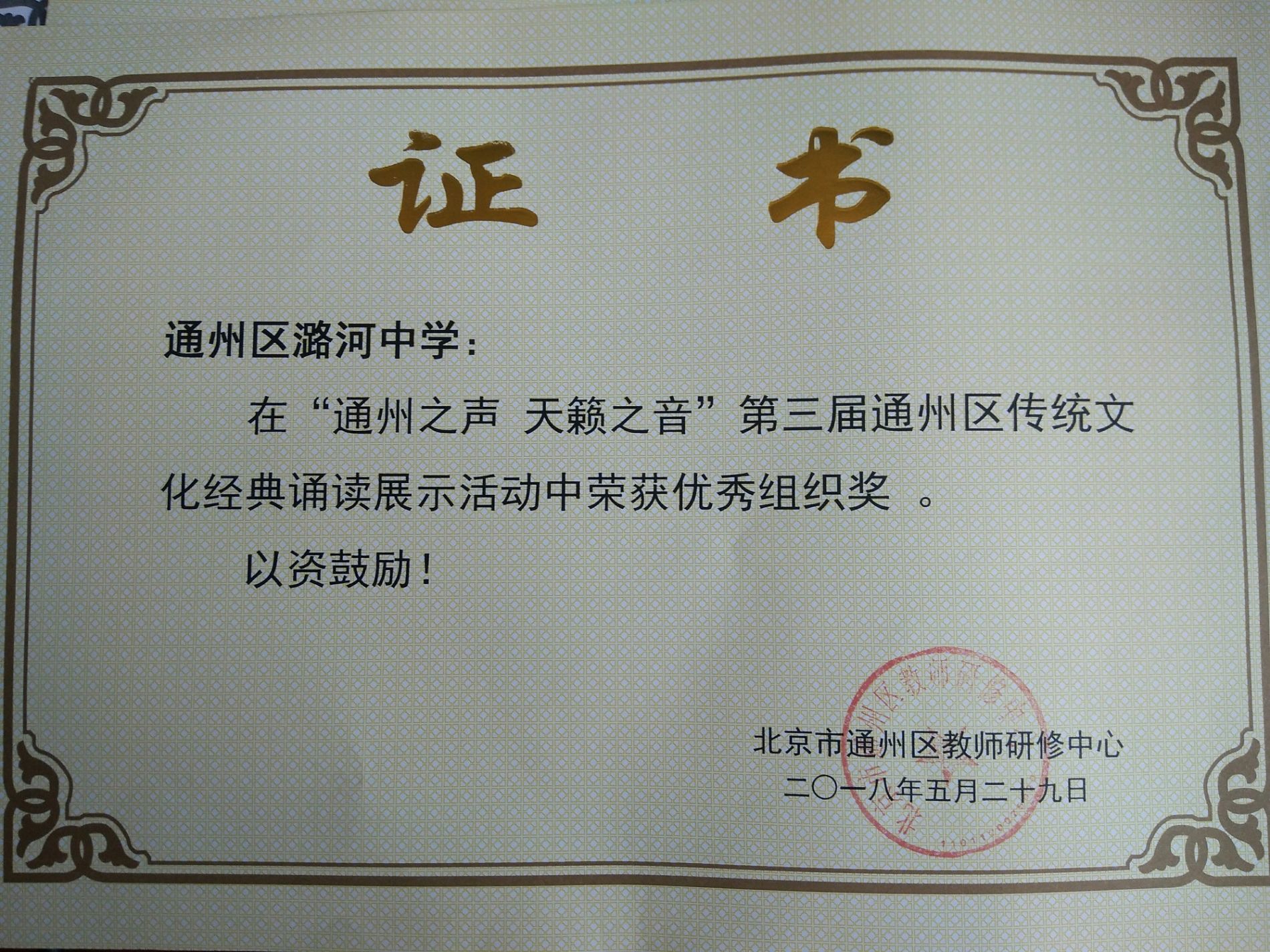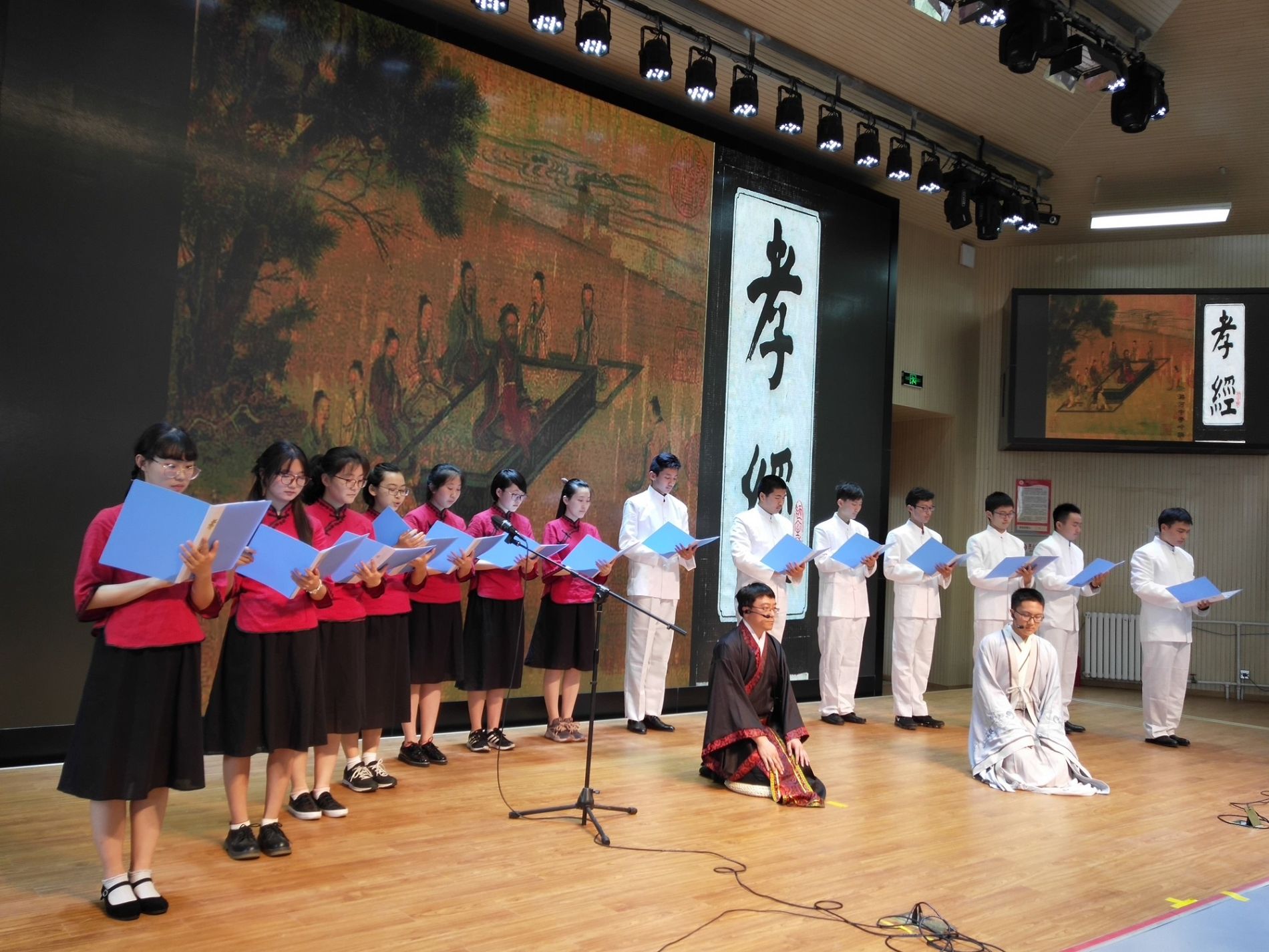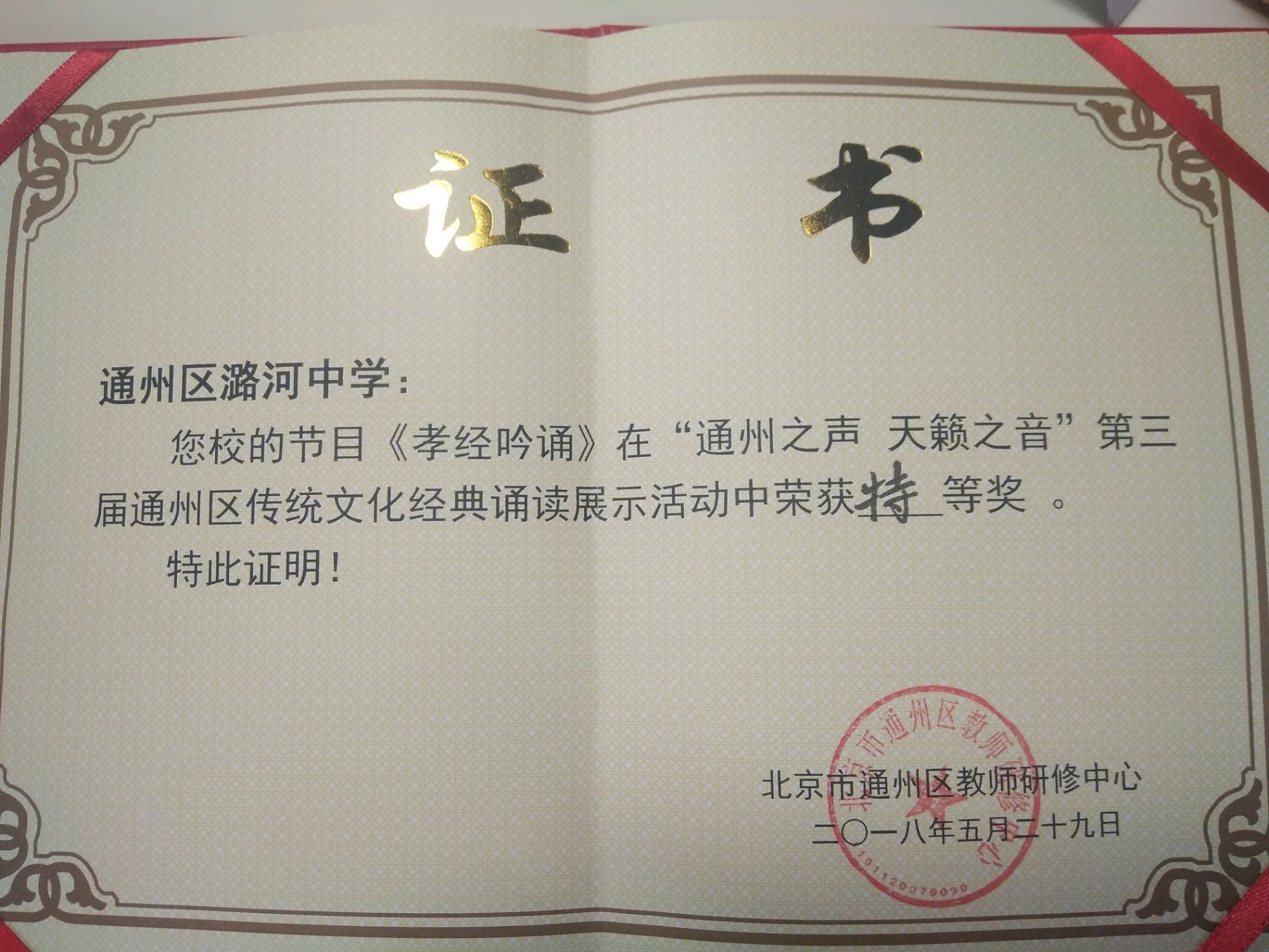 5月29日,由北京市通州区教师研修中心主办的“通州之声 天籁之音”第三届通州区中小学幼儿园经典诵读大赛决赛在北京教科院通州区第一实验小学隆重举行。此次活动吸引了全区54家中小学幼儿园参加,各种诵读节目精彩纷呈。首都师范大学教授冷卫国、徐健顺等专家参与了现场的评审和点评。最终,我校的节目——“《孝经》唐调吟诵”在决赛展演的23个节目中脱颖而出,喜获特等奖!参赛的学校中,潞河中学是少数几个高中校之一,为表彰我校的国学经典诵读工作,大会组委会还为我校颁发了优秀组织奖。