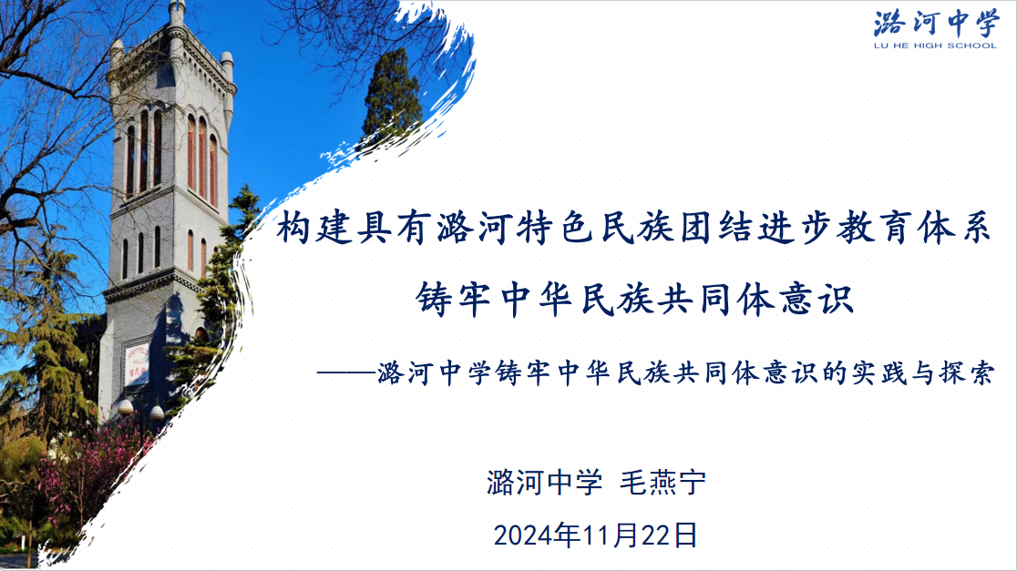 为进一步深化铸牢中华民族共同体意识教育课程教学,有形有感有效推进学校铸牢中华民族共同体意识教育,2024年11月22日北京教科院基教研中心中学 德育课程教研室在在在潞河中学召开“铸牢中华民族共同体意识教育融入高中思政课”教学研讨活动。