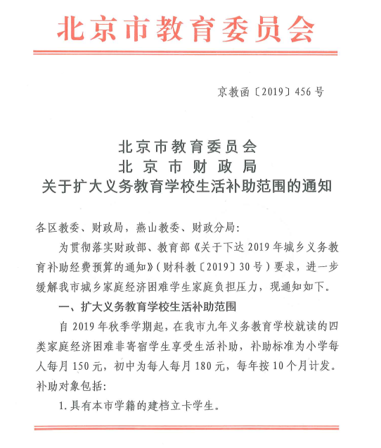 义务教育2-北京市教育委员会北京市财政局关于扩大义务教育学校生活补助范围的通知(京教函〔2019〕456号)
