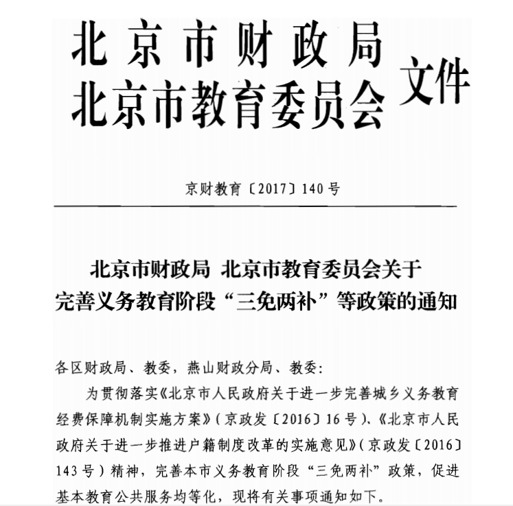 义务教育1-关于完善义务教育阶段“三免两补”等政策的通知(京财教育[2017]140号)