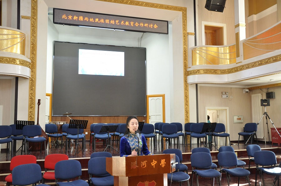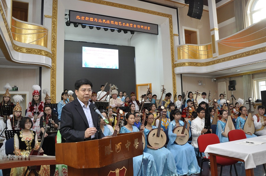 活动当天进行了民族团结艺术教育的交流发言,潞河中学“韵之灵”国乐团指挥谢丹老师、伊犁哈萨克自治州歌舞剧院叶尔江·阿布力哈孜院长、新疆生产建设兵团第三中学杨靖录校长、中国传媒大学援疆干部、新疆艺术学院音教系副主任宋素丽教授分别进行了关于民族团结艺术教育的专题发言;通州区黄世喆副区长随后进行了讲话对潞河中学民族团结艺术教育的这种形式非常的赞同,并对潞河中学的新疆班工作以及艺术教育工作也进行了高度的肯定。最后,教育部体育卫生与艺术教育司副司长、中央国家机关第九批援疆干部、新疆兵团教育局党组成员、副局长刘培俊发表了重要讲话。刘司长从德智体美劳五大育人新体系大框架,对潞河中学贯彻中央教育方针及美育特色进行了高度肯定。刘司长指出,北京市通州区潞河中学与新疆两地这种民族团结艺术教育的模式值得思考,如何让学生从美育中能更开阔视野,如何培养德智体美劳的全面人才分别进行了详细的阐述。并高度赞扬了潞河中学关于落实德智体美劳的好的做法。