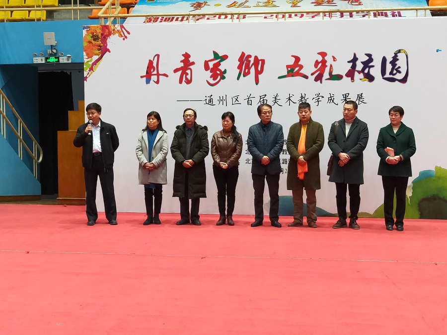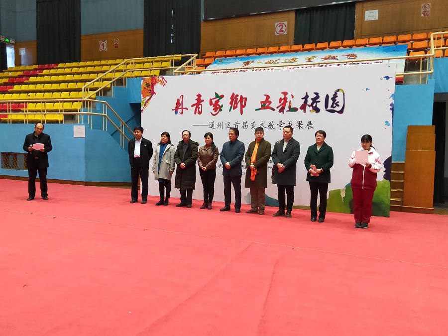 11月24日上午,由通州区教委、通州区教师研修中心共同主办的“丹青家乡五彩校园——通州区首届中小学美术教学成果展” 在北京市通州区潞河中学体育馆内隆重举行。通州区教委袁静华副主任、通州区教师研修中心唐桂春副院长、中国书法家学会理事、北京书法家学会副主席杨广馨、原北京教育学院体育与艺术学院副院长、美术学科国培专家巩平教授、东城区教研中心特级教师、京版教材责任主编、国培专家何墨荣、北京教科院基教研中心美术教研员耿鑫、北京教育学院美术系主任、中国美协会员,美术学科国培专家林泰然教授以及区各直属学校分管美育工作的领导、我校徐华校长、谢宏春副校长以及新闻媒体、全区中小学美术教师、部分学生代表及家长参与了此次活动。