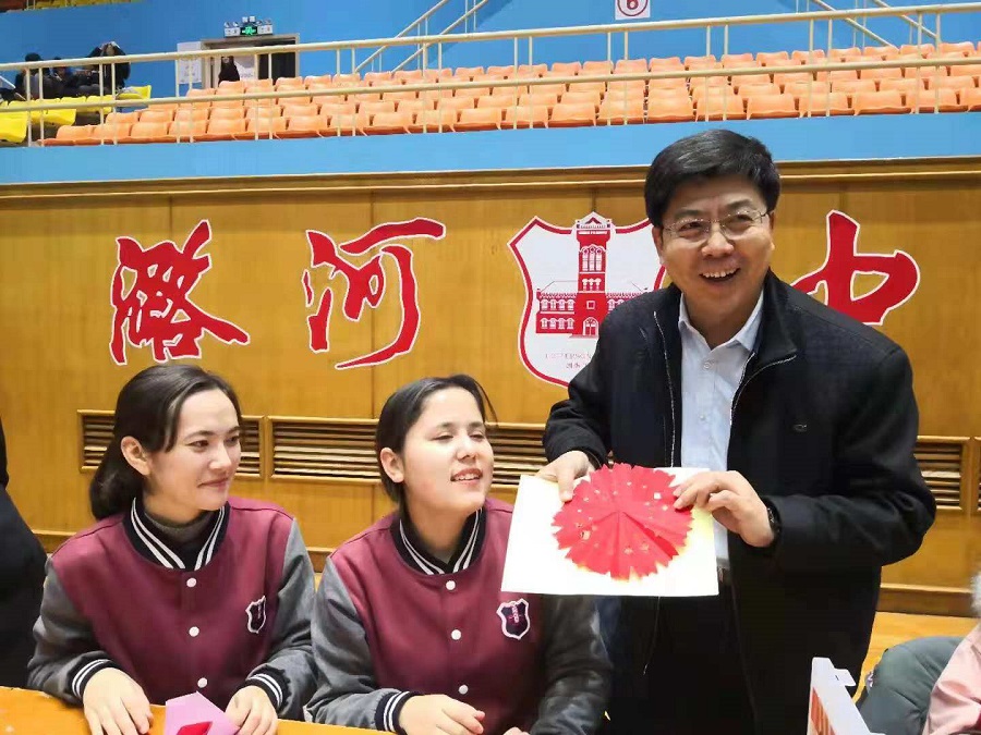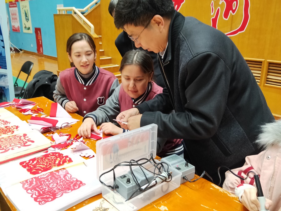 徐华校长发表了致辞,分别从美术学习、校园美育、美术教学的角度表达了自己的感受和愿望。我校在此次展览中共展示了包括雕塑、油画、剪纸作品80余幅同时还进行了剪纸和烫画的现场展示。受到参观者的一致好评。