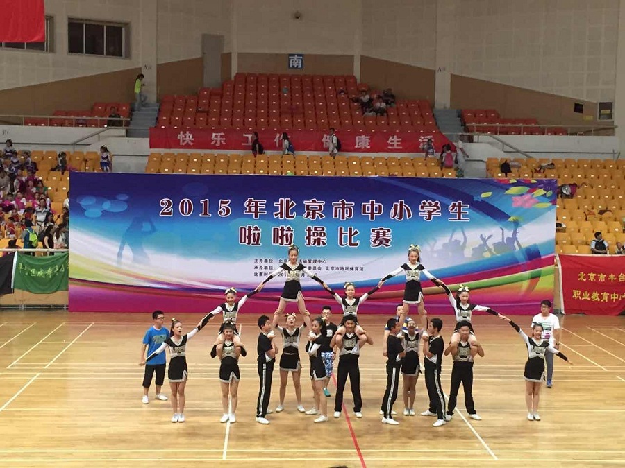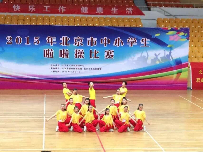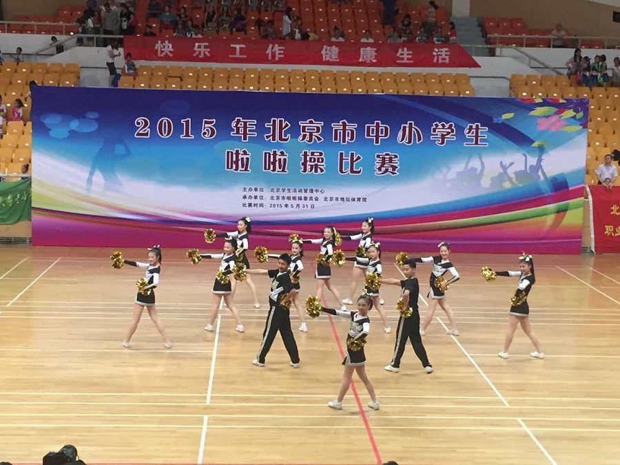 “2015年北京市中小学生啦啦操比赛“于5月31日在北京地坛体育馆举行,两千多名中小学啦啦操精英和爱好者齐聚于此,我校初中健美操队在吕哲和王倩老师的带领下,分别获得街舞规定啦啦操、花球自选啦啦操、技巧啦啦操三个项目的第一名。队员们的精彩表现征服全场,并在啦啦操开幕式上受邀进行技巧啦啦操表演,受到了北京市教委领导和裁判及观众们的一致好评。