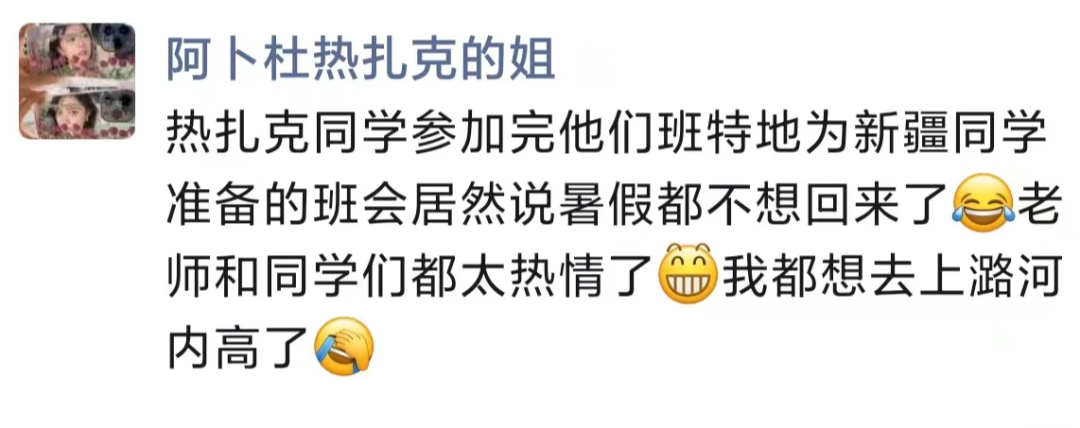 谢谢老师和同学们让我们分享新疆的文化,我很自豪能来到潞河中学,成为内高班的一员,在北京交到很多的朋友,将来考一个好大学,希望疫情早点结束,能和大家相聚。
