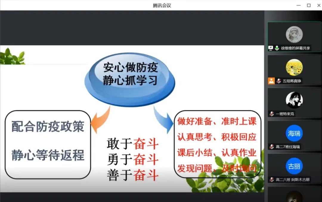 接下来,年级主任徐老师对9月份内高同学居家表现进行了小结,赞扬了优秀表现,也针对接下来的在疆居家学习生活提出了具体要求。要求学生谨记潞河人“一切为了祖国”的校训,“敢于奋斗”的高二年级精神,从一点一滴做好防疫工作做起;做好家务,为父母分忧;做好自己,全身心投入学习,奋发向上,积极参与线上活动。面对各种困难,学生也要学会与身边的父母,以及通过网络与班主任、年级主任、任课教师、导师和同学共同探讨,大家齐心协力,攻克难关。