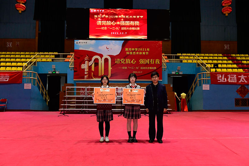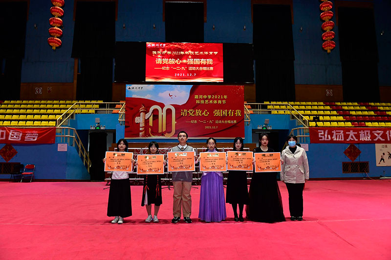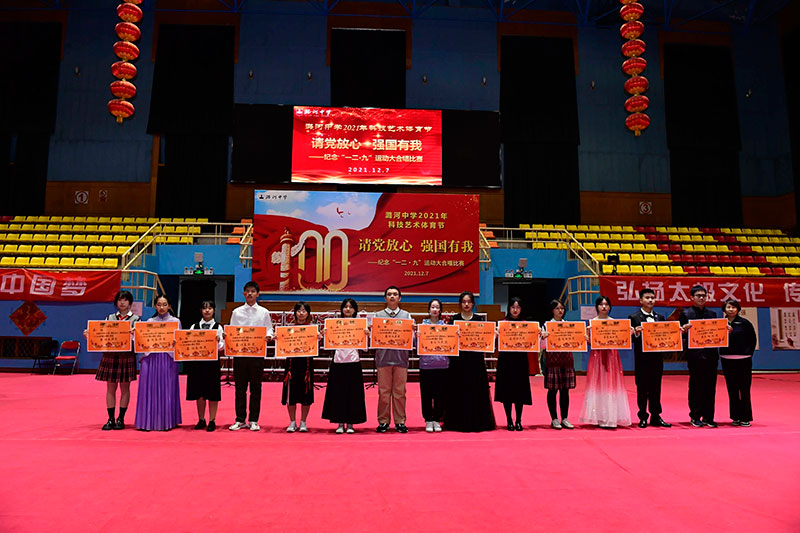 高一12班《我们走在大路上》、高一11班《我们是共产主义接班人》、高一3班《爱我中华》