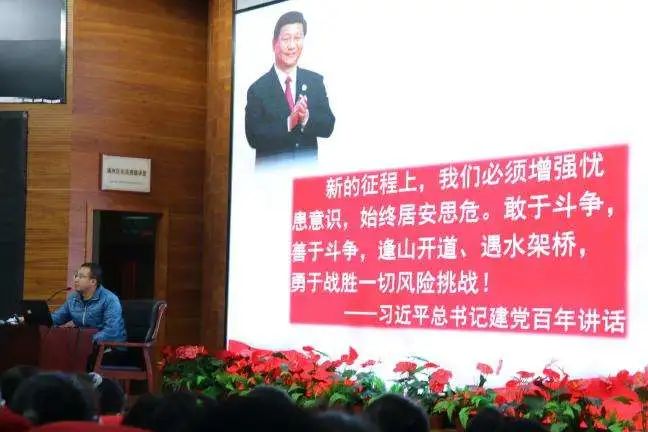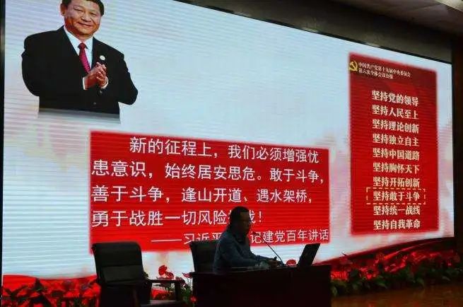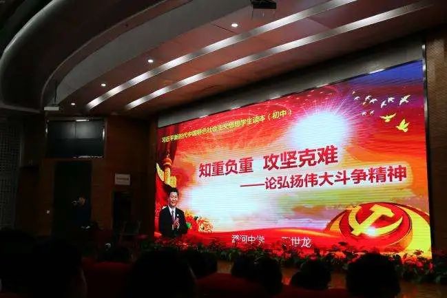 习近平总书记在建党百年讲话中说,要始终居安思危,敢于斗争,善于斗争,逢山开道,遇水架桥,敢于战胜一切风险挑战。党的十九届六中全会把“坚持敢于斗争”作为党的百年奋斗十条历史经验之一。为充分学习总书记讲话,贯彻党的十九届六中全会精神,潞河中学初二年级于2021年12月6日在第一报告厅开展了“弘扬斗争精神 敢于攻坚克难”的主题学习活动。该活动是初二年级“遇见”系列课程之“遇见思想”的重要载体,同时也是对《习近平新时代中国特色社会主义思想读本》的第三次集中学习。出席活动的领导和老师有学生处副主任王雷老师,初二年级主任李玉顺老师,初二年级各班主任老师等。活动继续邀请我校政治组王世龙老师授课,他以“知重负重 攻坚克难——论弘扬伟大斗争精神”为题,用鲜活生动的语言,深入浅出的讲解,为四百余师生奉献了一场精彩的思想盛宴。