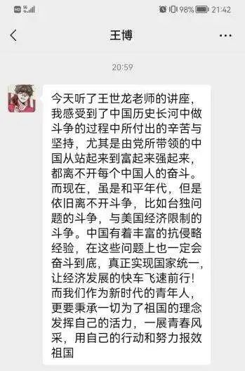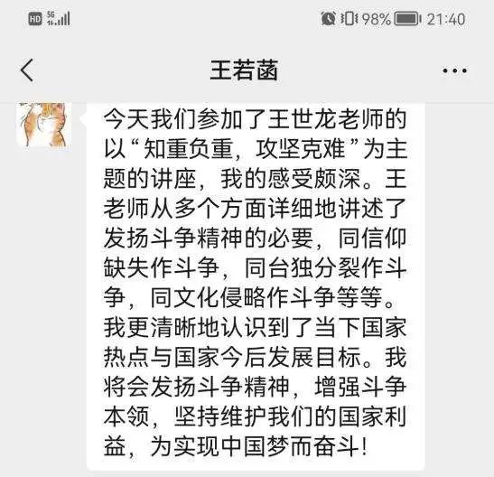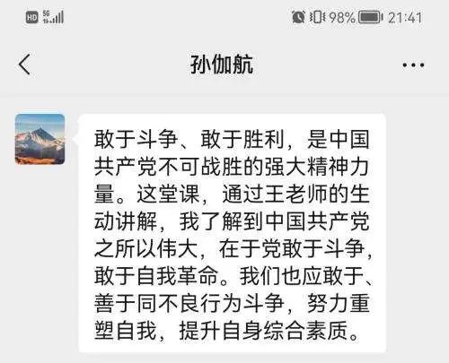 首先,王老师带领同学们一起学习了总书记建党百年讲话和十九届六中全会原文,明白了伟大斗争精神对于党和国家事业发展的重要意义。知道了斗争精神不仅是革命战争年代的必需,更是新时代中国特色社会主义建设的呼唤。同新冠疫情作斗争,同黑恶势力作斗争,同贪污腐败作斗争,同前进道路上一切艰难险阻作斗争,是我们从胜利走向胜利的必然要求。