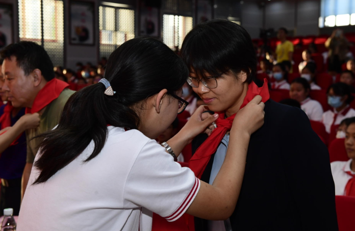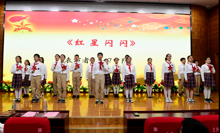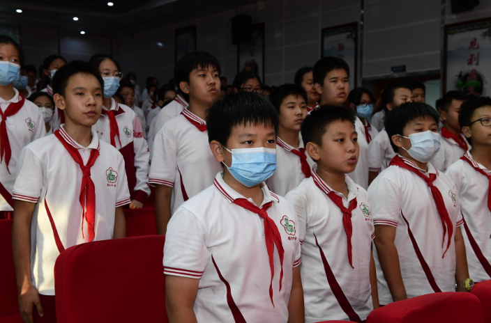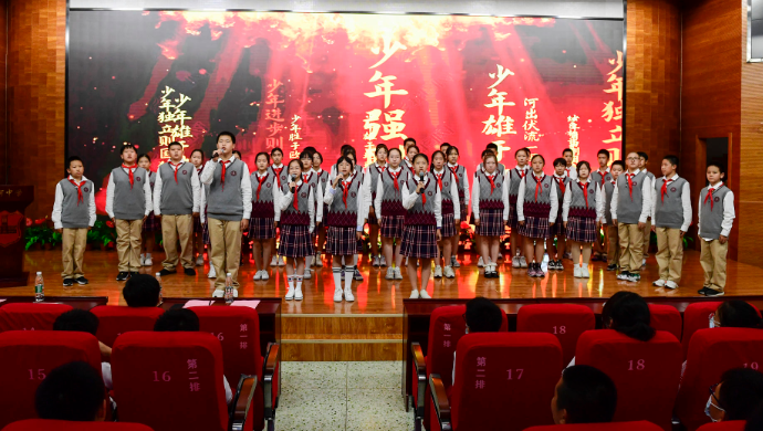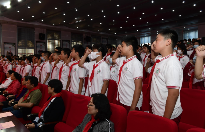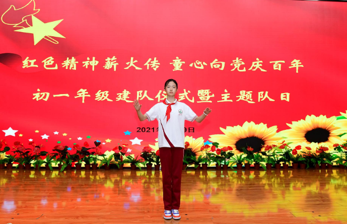 在刘以奇同学的指挥下,初一年级全体少先队员高唱队歌《我们是共产主义接班人》,嘹亮的歌声里,萦绕着队员们对少先队组织的信仰、依恋与自豪。