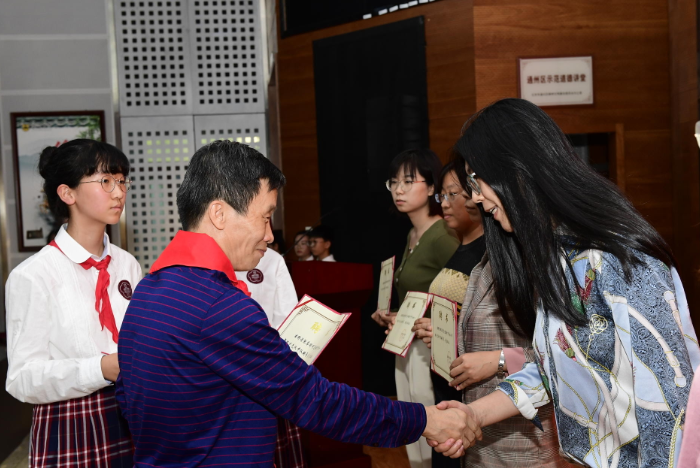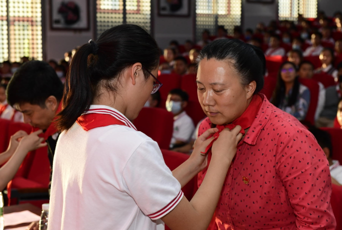 谢宏春副校长为辅导员颁发聘书,少先队员向辅导员佩戴了鲜艳的红领巾。
