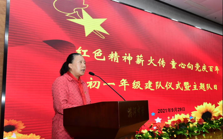 刘晓蕾主任向大队授旗,宋久峰主任向初一年级新建中队授旗。