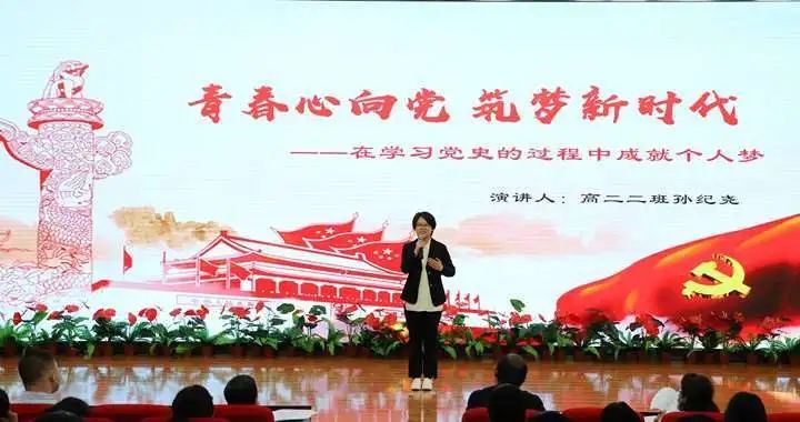 在点评发言中,语文教研室主任贾一震老师给予了演讲同学高度的肯定,并就演讲材料的准备、演讲技巧的提高等方面予以了细致的指导。在总结讲话中,谢校长为同学们解读了“青春心向党,筑梦新时代”的深刻寓意,并勉励大家要做到学史明理、学史增信、学史崇德、学史力行,志存高远,脚踏实地,迎接新时代,书写属于我们的新华章。